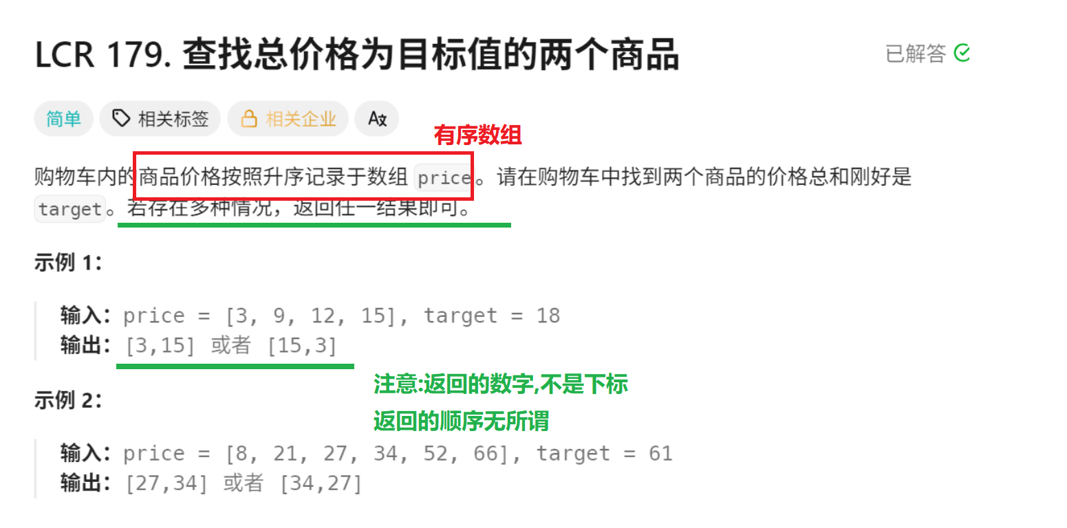 1.暴力枚举O(N^2):固定一个数,让这个数和另一个数匹配相加=target,则返回否则固定下一个数,两层for,时间复杂度太大了,题目给的是有序数组,利用单调性
