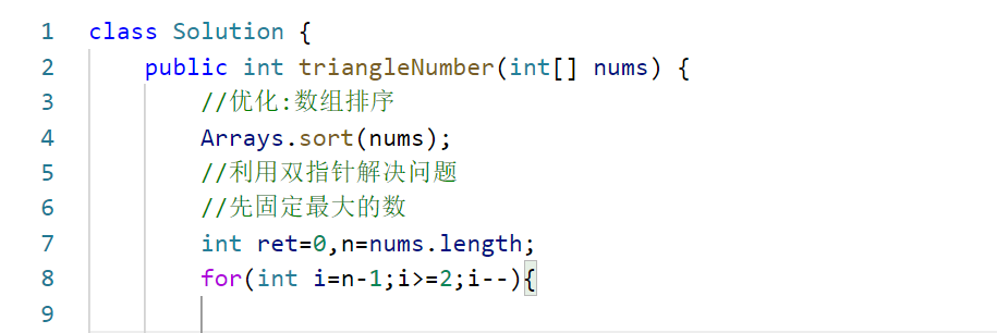 4.在最大的数左区间内,使用双指针,统计有效三角形个数