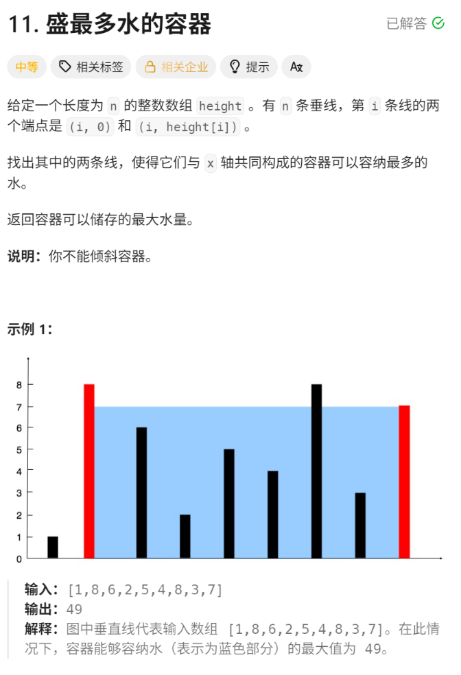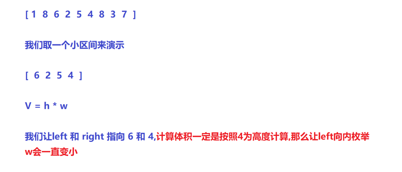 无论是哪种情况,向内枚举的V一直都是减小的,我们要找最大的容器,那么我们就可以大胆舍弃当前双指针 中的较小的值,将较大的值固定,当然若两个值相等舍弃谁都行 --O(n)