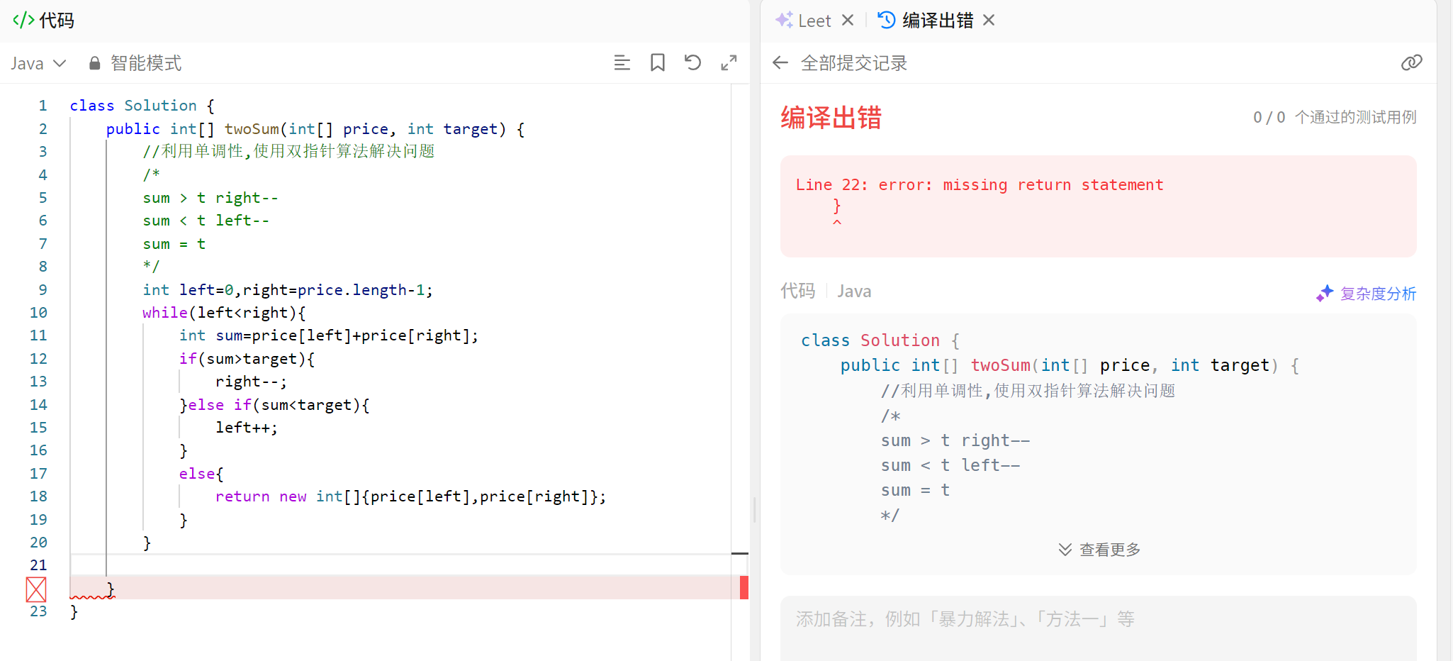 我们必须保证所有路径都有返回值,但我们的上述代码,如果没有两数之和为target,就不会有返回值
