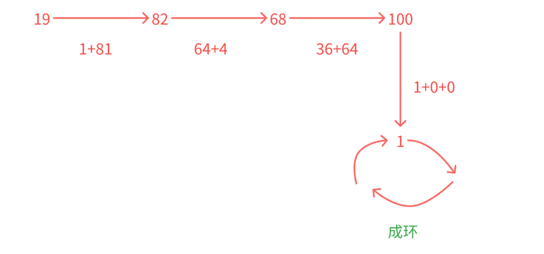 还有一种情况也会成环但是环内的值并不是1 =>不是快乐数