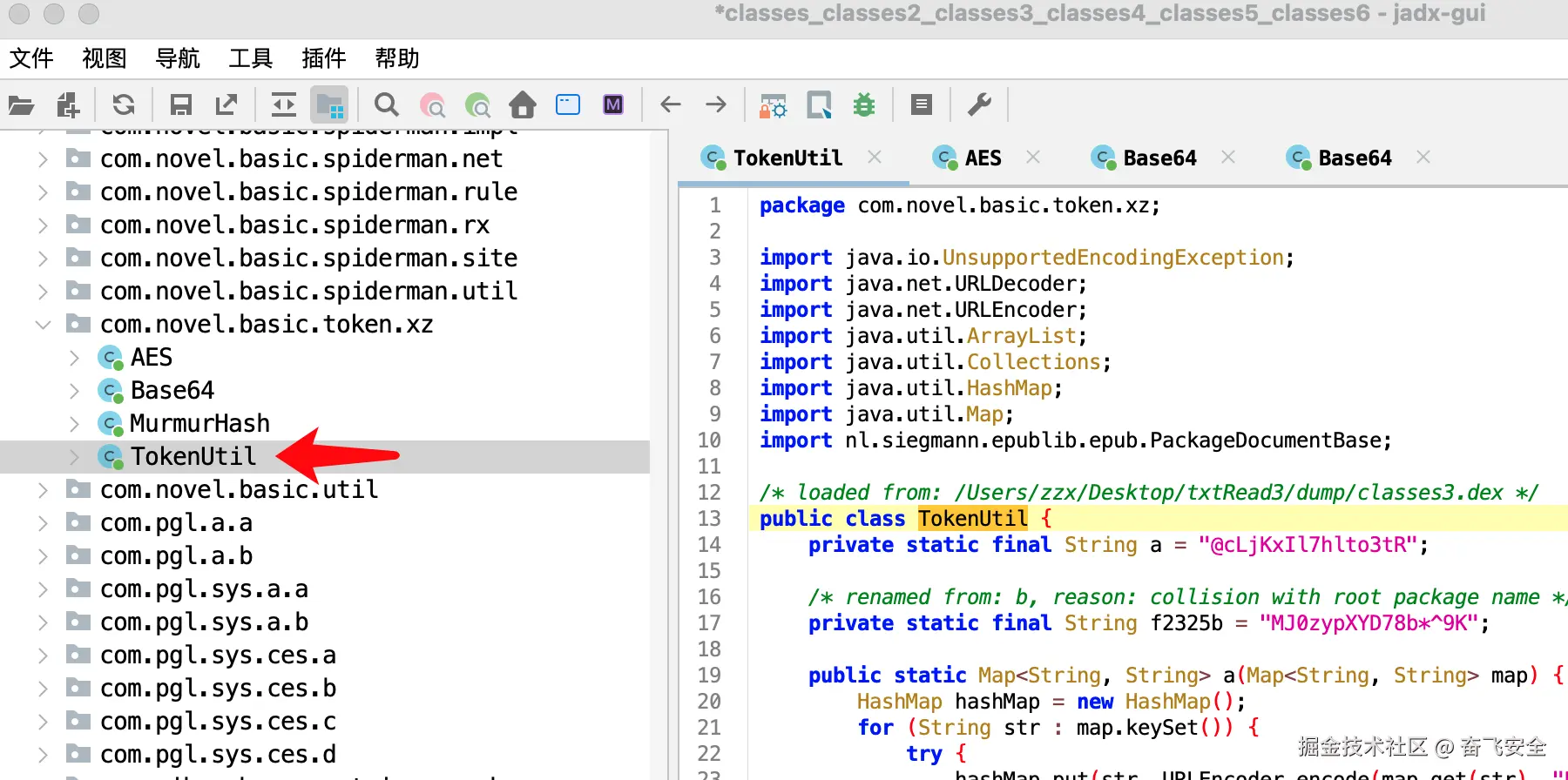 神奇的是,我们没有找到 com.novel.basic.token 包,也许是dump的时候丢了。更神奇的是,我们找到了一个 com.novel.basic.token.xz 包,里面有个看上去浓眉大眼的 TokenUtil类