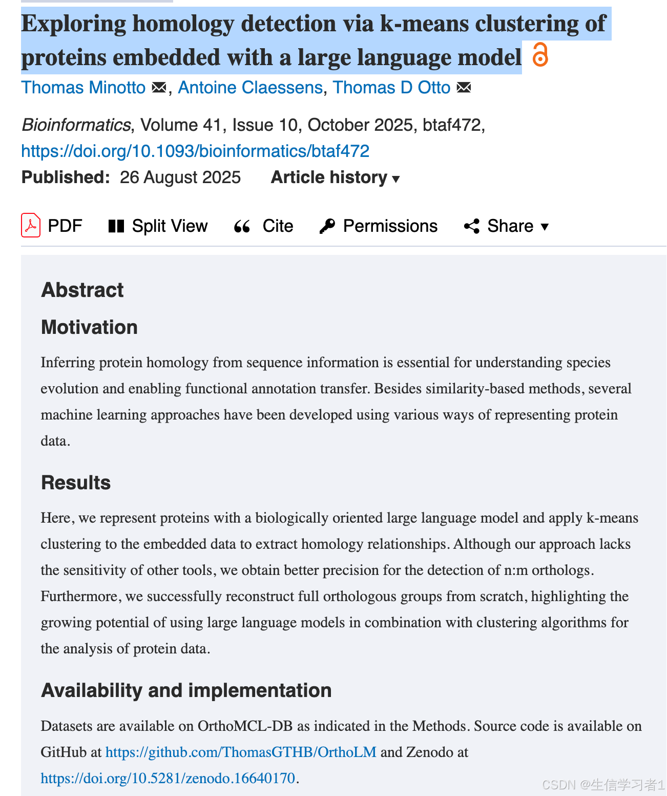 近来,基于机器学习的无比对方法已成为进行同源性检测的强大替代手段。例如,DeepSeqProt(大卫和哈兰奇 2023 年)采用编码器-解码器神经网络来构建同源蛋白质的簇。这些方法中的许多都利用蛋白质序列的数值表示,即嵌入,而非直接比较氨基酸组成,将序列信息编码到高维空间中。哈马姆西等人(2024 年)使用多个变换器编码层来创建序列的 512 维表示,并计算每对蛋白质之间的余弦距离以寻找远程同源体。罗森等人(2024 年)利用 ESM 嵌入模型(里维斯等人 2021 年)创建蛋白质的 1280 维表示,并应用改进的 k 均值算法来创建相似蛋白质的簇,从中可以提取同源对。SonicParanoid2(科森蒂诺等人 2024 年)使用 Doc2Vec 嵌入生成具有高准确性和速度的同源组。总的来说,近期针对蛋白质开发的大型语言模型取得了显著进展,例如 SeqVec(海辛格泽等人,2019 年)、ProtT5(埃尔纳加尔等人,2022 年)或 ESM(里维斯等人,2021 年),这些模型有望提升蛋白质的表示能力并实现更精细的分析。