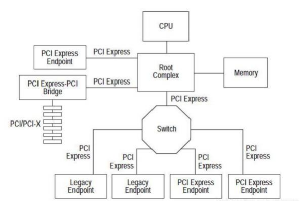 PCIE体系架构一般包含根组件RC( rootcomplex),交换器switch,终端设备EP( endpoint)等类型的PCIE设备组成。 RC在总线架构中只有一个,用于处理器和内存子系统与I/O设备之间的连接,而switch的功能通常是以软件形式提供的,它包括两个或更多的逻辑PCI到PCI的连接桥(PCI-PCI Bridge),以保持与现有PCI兼容,具体功能类似现在的网络交换机。