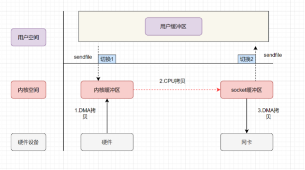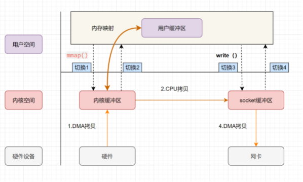 可以发现, mmap+write 实现的零拷贝, I/O发生了4次用户空间与内核空间的上下文切换,以及3次数据拷贝。其中3次数据拷贝中,包括了2次DMA拷贝和1次CPU拷贝。