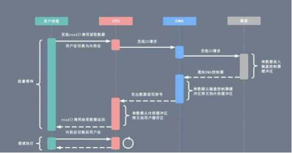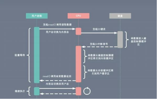 用户进程向 CPU 发起 read 系统调用读取数据,由用户态切换为内核态,然后一直阻塞等待数据的返回。