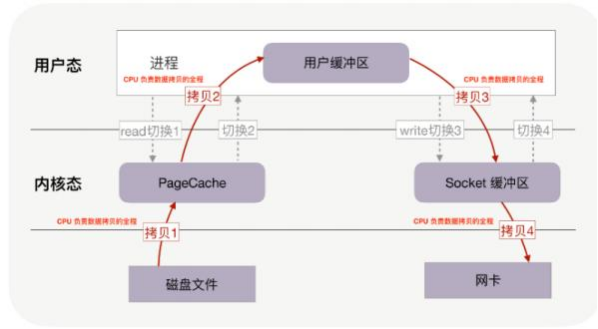 多),但是如果要 CPU 全程负责内存与磁盘、 内存与网卡的数据拷贝,这将难以接受,因为磁盘、网卡的 I/O 速度远小于内存; 4 次copy 太多了, 4 次上下文切换也太频繁了;