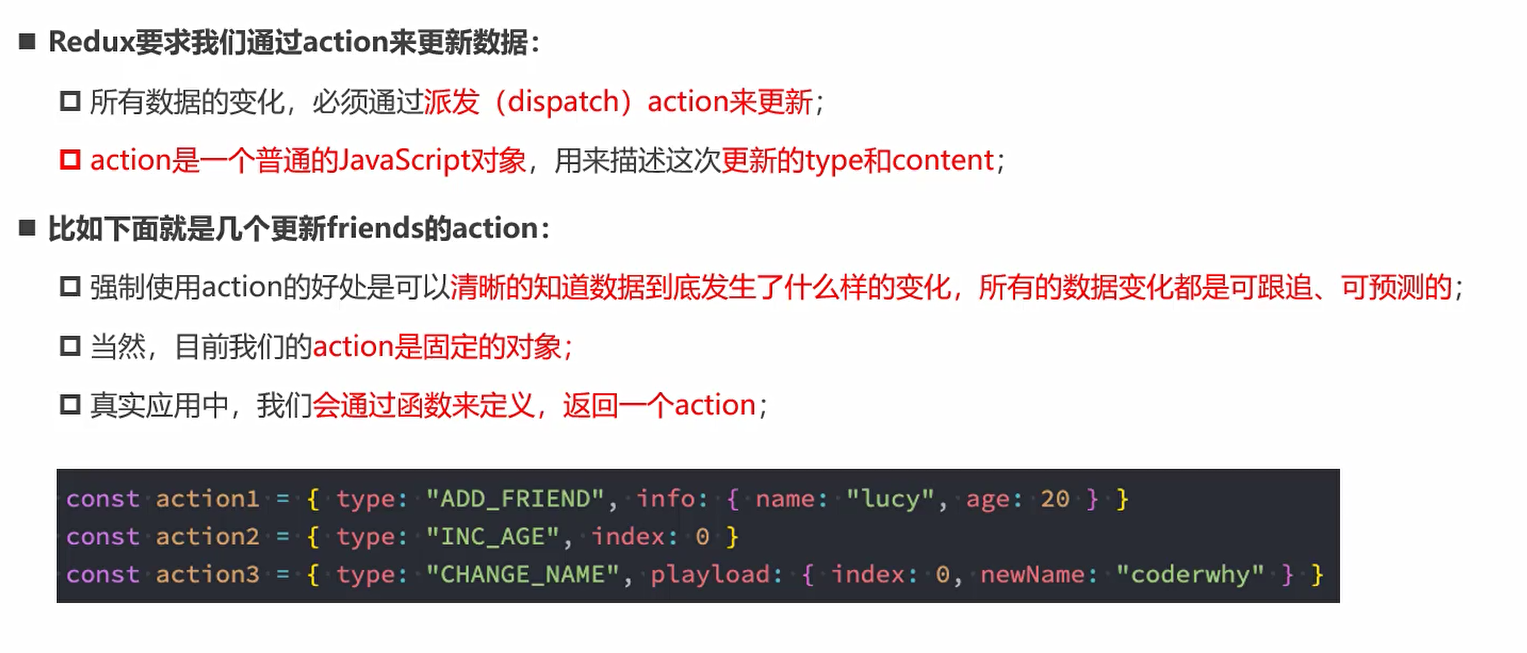,不要试图在其他地方通过任何的方式来修改State; - 这样就确保了View或网络请求都不能直接修改state,它们只能通过action来描述自己想要如何修改state;