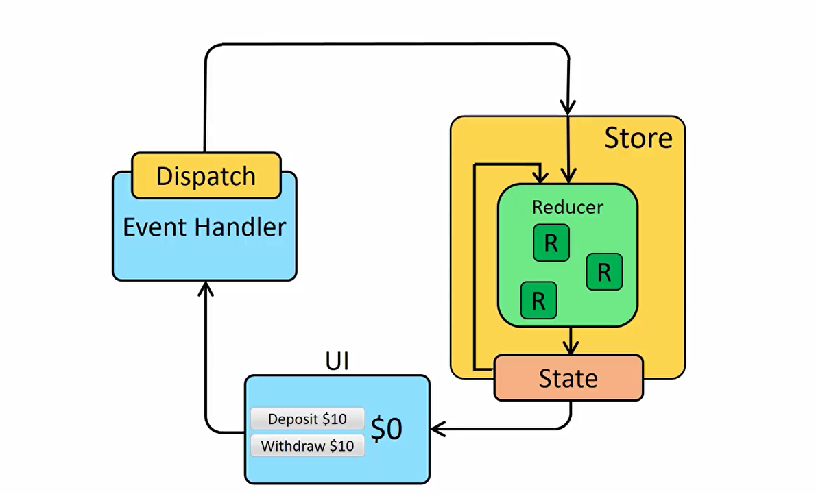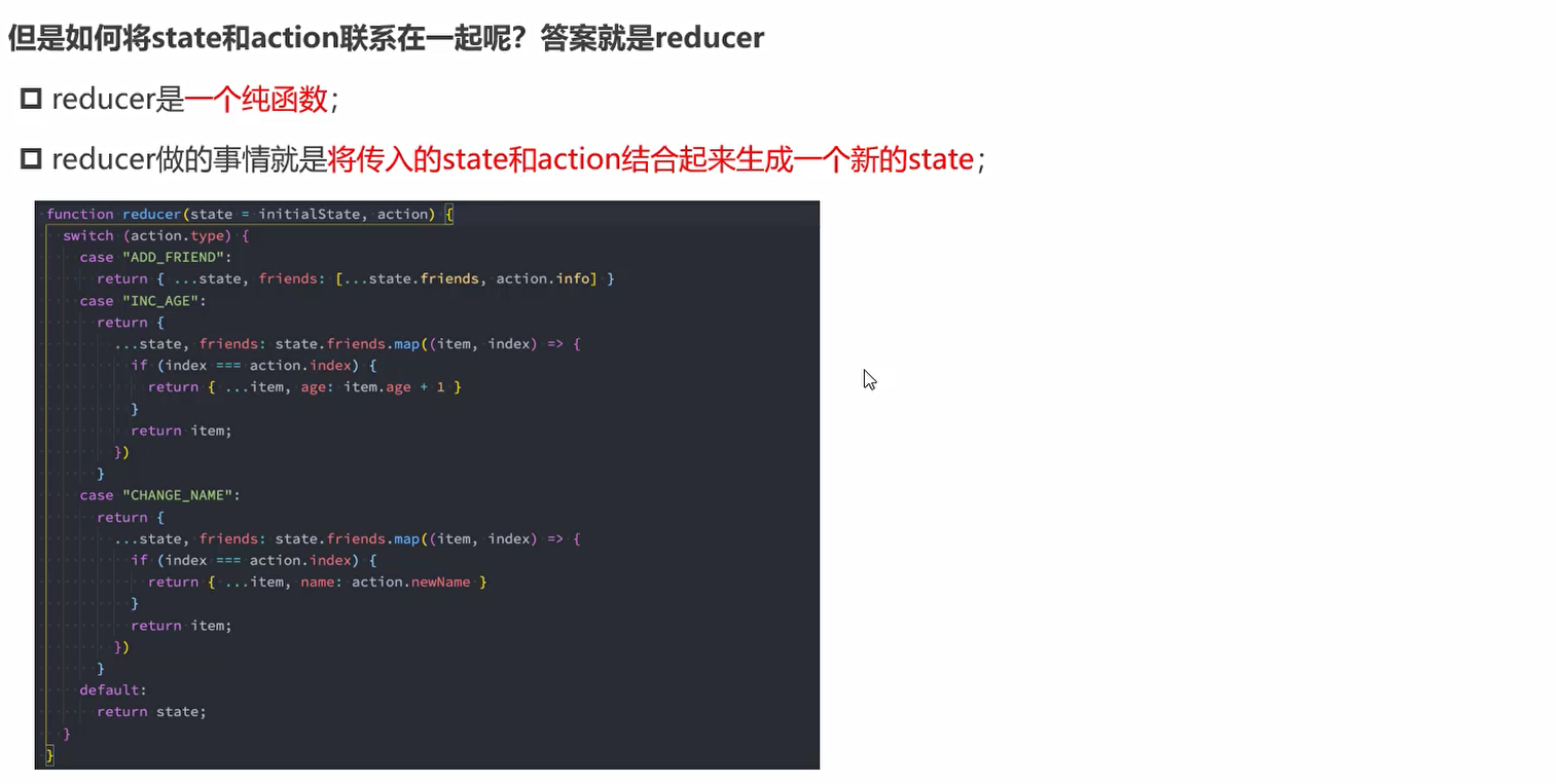 - 通过reducer将旧state和actionsl联系在一起,并且返回一个新的State: