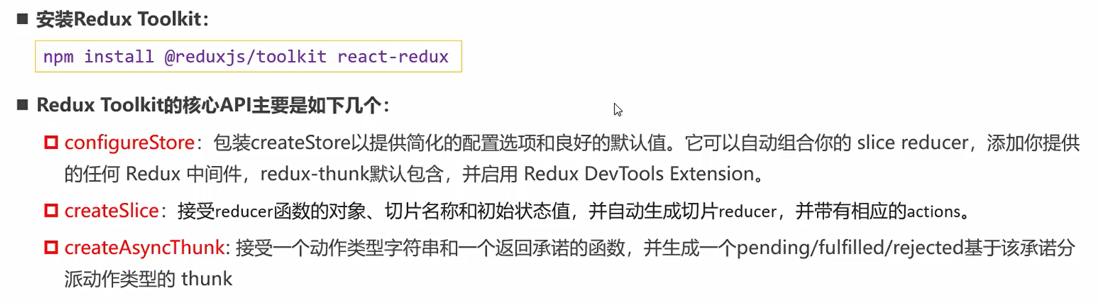 - ReduxToolkit包旨在成为编写Redux逻辑的标准方式,从而解决上面提到的问题;