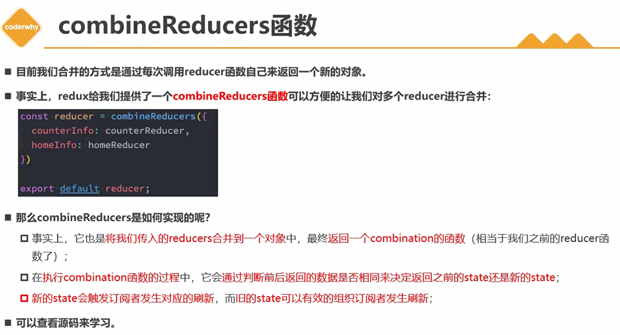 - 随着应用程序的复杂度增加,我们可以将reducer拆分成多个小的reducers,分别操作不同state tree的一部分;