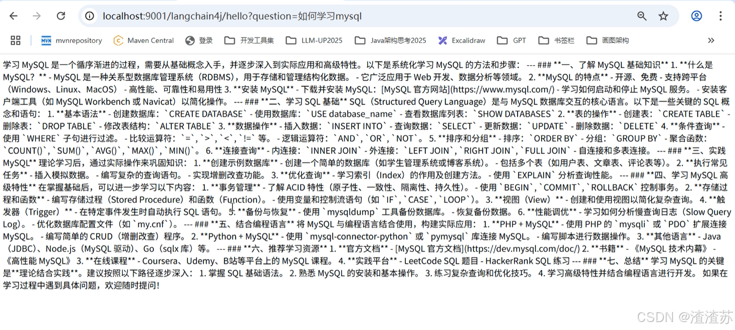 http://localhost:9001/langchain4j/hello?question=如何学习mysql