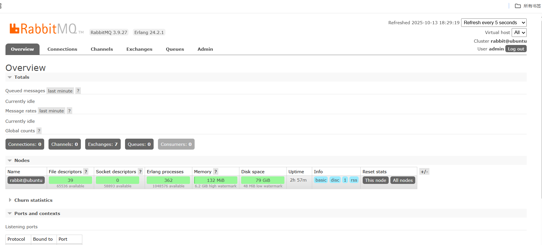 从上图中可以看出,消息并不是先进入队列的,而是先进入交换机,由交换机分发到队列中,然后消息通过管道发送给消费者.然后再看客户端界面: