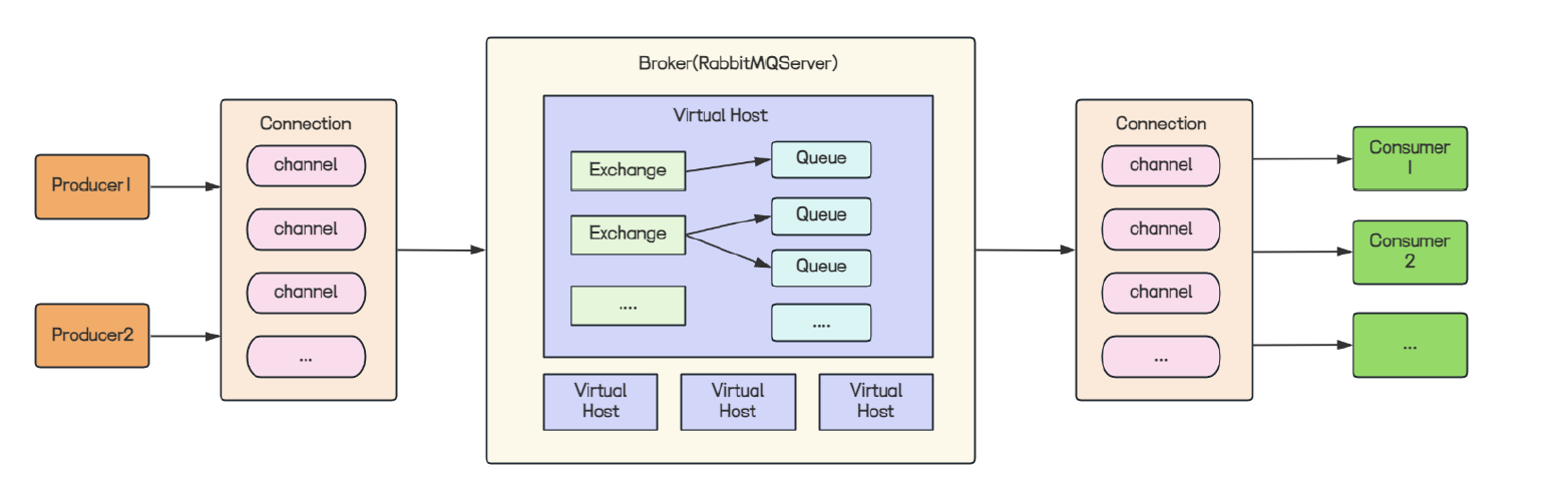 其中Producer是生产者,产生消息的,Connection是连接,channel是管道,Broker是RabbitMq服务器