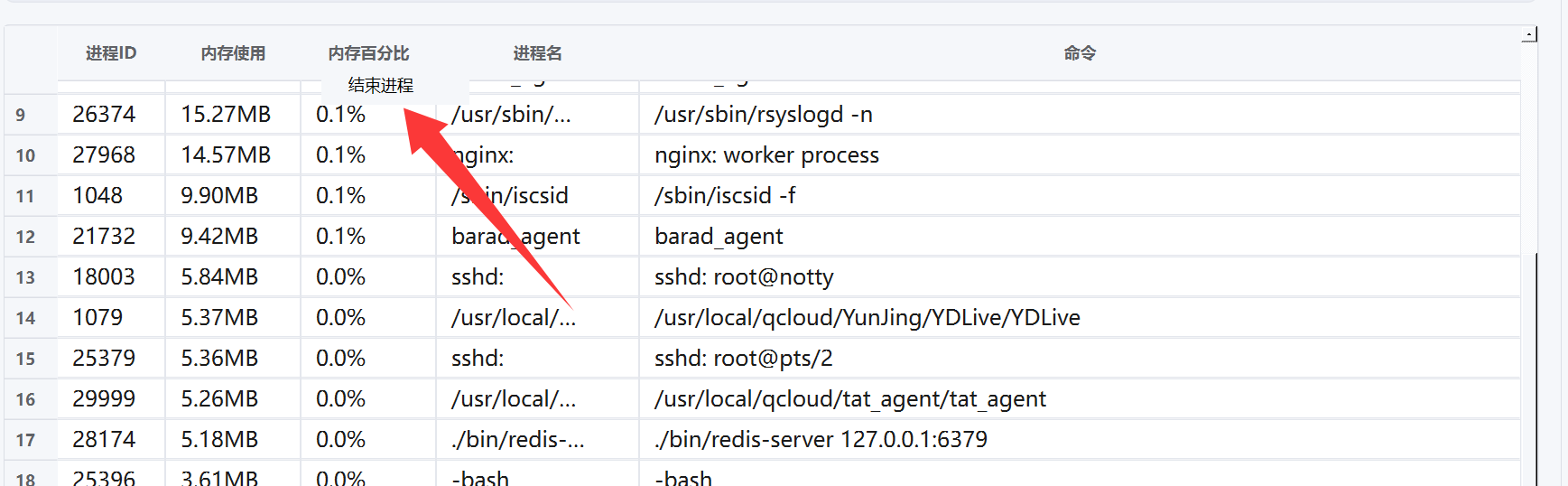 内存监控是10秒刷新一次监控, 获取的是服务器top20按内存降序的进程信息。右键可以结束掉进程。