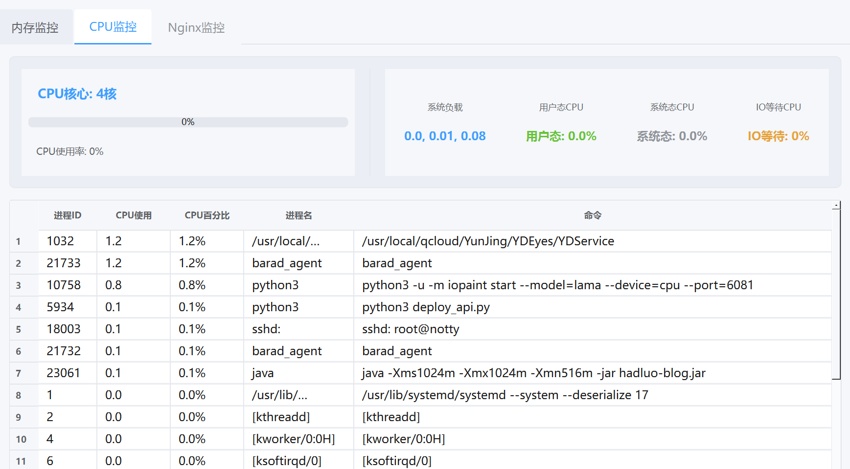 cpu监控是10秒刷新一次监控, 获取的是服务器top20按cpu使用降序的进程信息。右键可以结束掉进程。