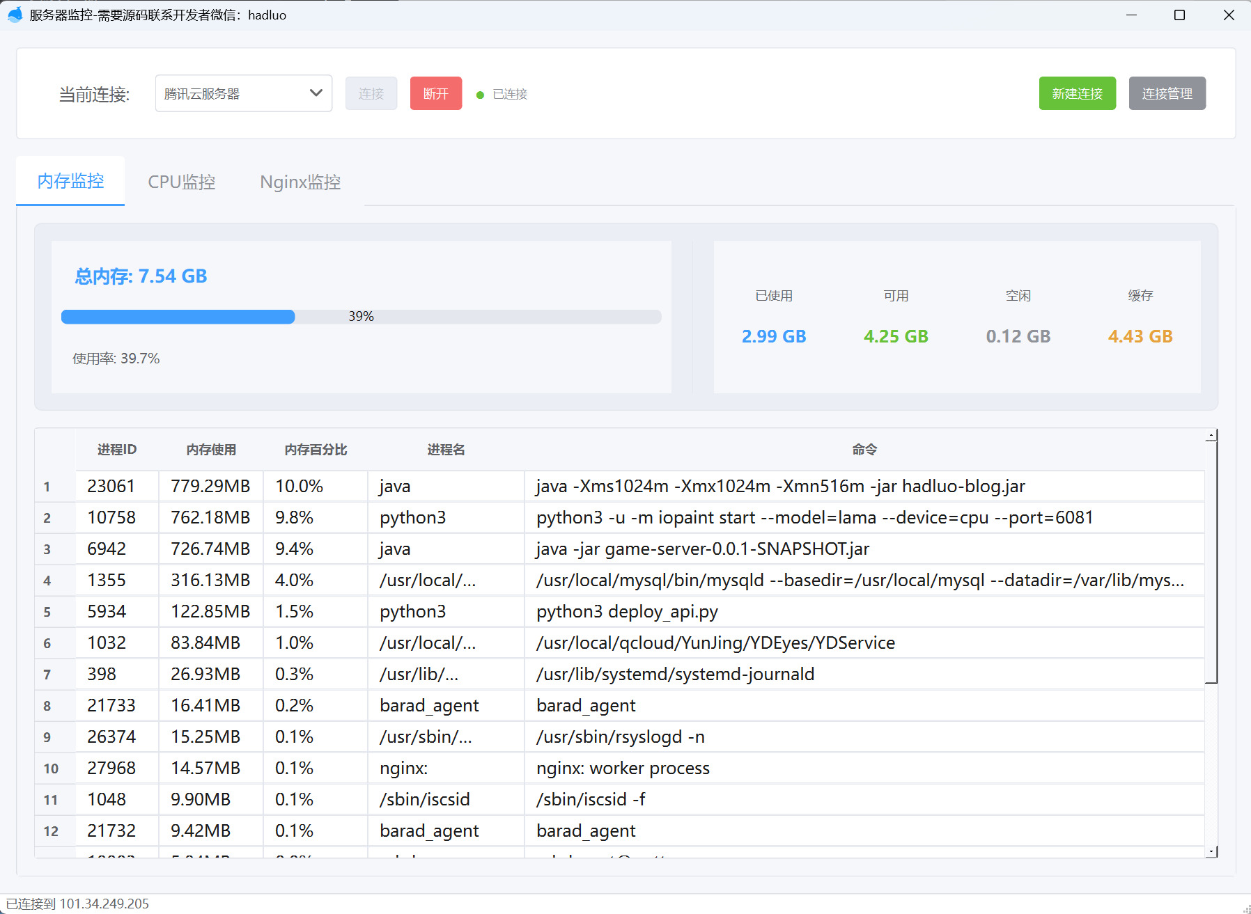 本人是站长,管理了三个网站,有3台服务器, 平时需要看内存,cpu,还有nginx的监控, 从而来高效的处理流量攻击,进程优化,访问量分析等。市面上已经有成熟的监控(普罗米修斯等),但是都太重量级,适合大型公司服务器集群使用, 于是自己写了一个exe软件,用于监控服务器 。