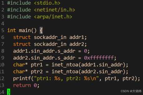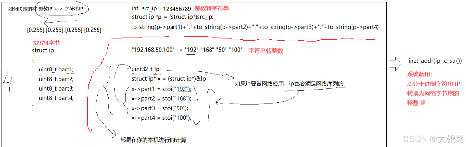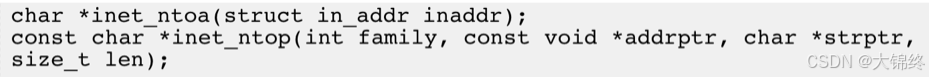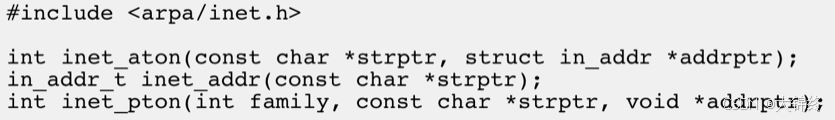 sockaddr_in中的成员struct in_addr sin_addr表示32位 的IP 地址,我们通常用点分十进制的字符串表示IP 地址,以下函数可以在字符串表示 和in_addr表示之间转换