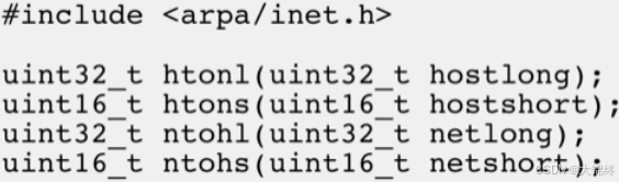- 为使网络程序具有可移植性,使同样的C代码在大端和小端计算机上编译后都能正常运行,可以调用以下库函数做网络字节序和主机字节序的转换。