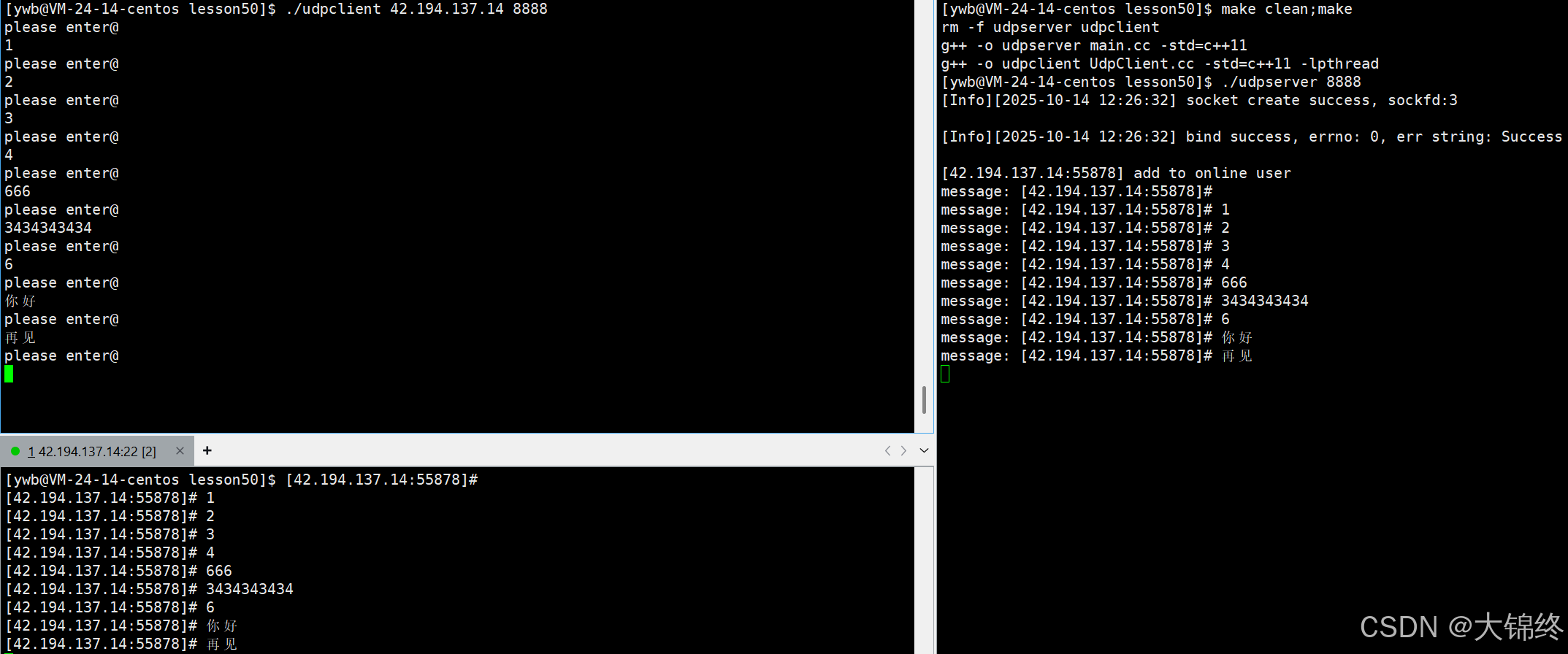 其余部分与上文基础版相同,这里注意makefile中要添加-lpthread链接线程库信息,下图为不同终端实现的打印结果