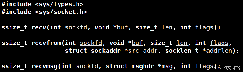 参数:在 recv 函数参数基础上,多了 src_addr(用于存储发送方地址信息的结构体指针)和 addrlen(用于指定地址结构体长度的指针,是输=输入输出型参数)。