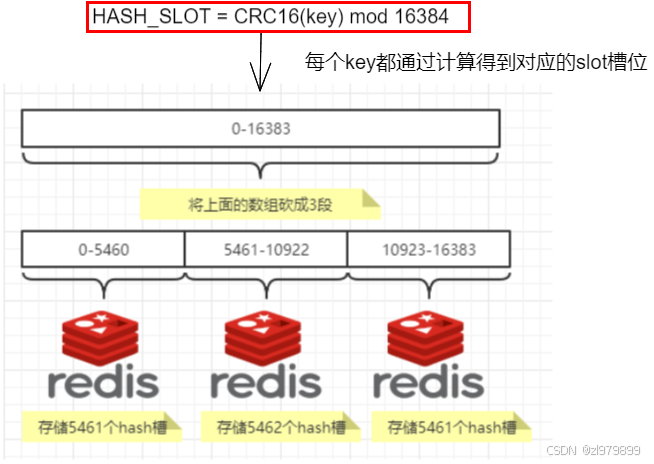 - 集群使用公式 CRC16(key) % 16384 来计算键 key 属于哪个槽, 其中 CRC16(key) 语句用于计算键 key 的 CRC16 校验和