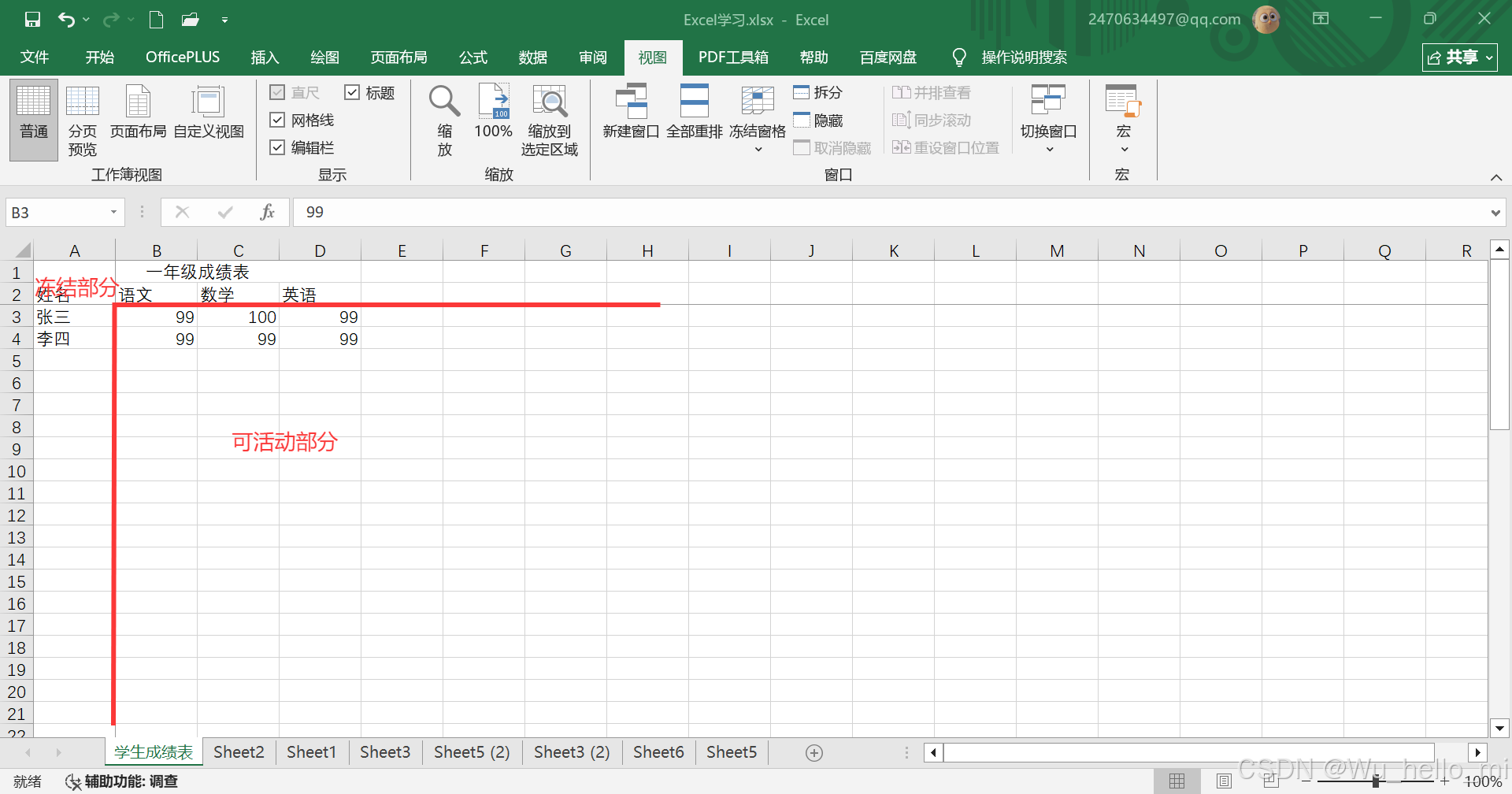 冻结范围:在选中的单元格左上角画一个水平垂直的直线,除了右下角那一块区域是可活动的,其他区域是冻结的。