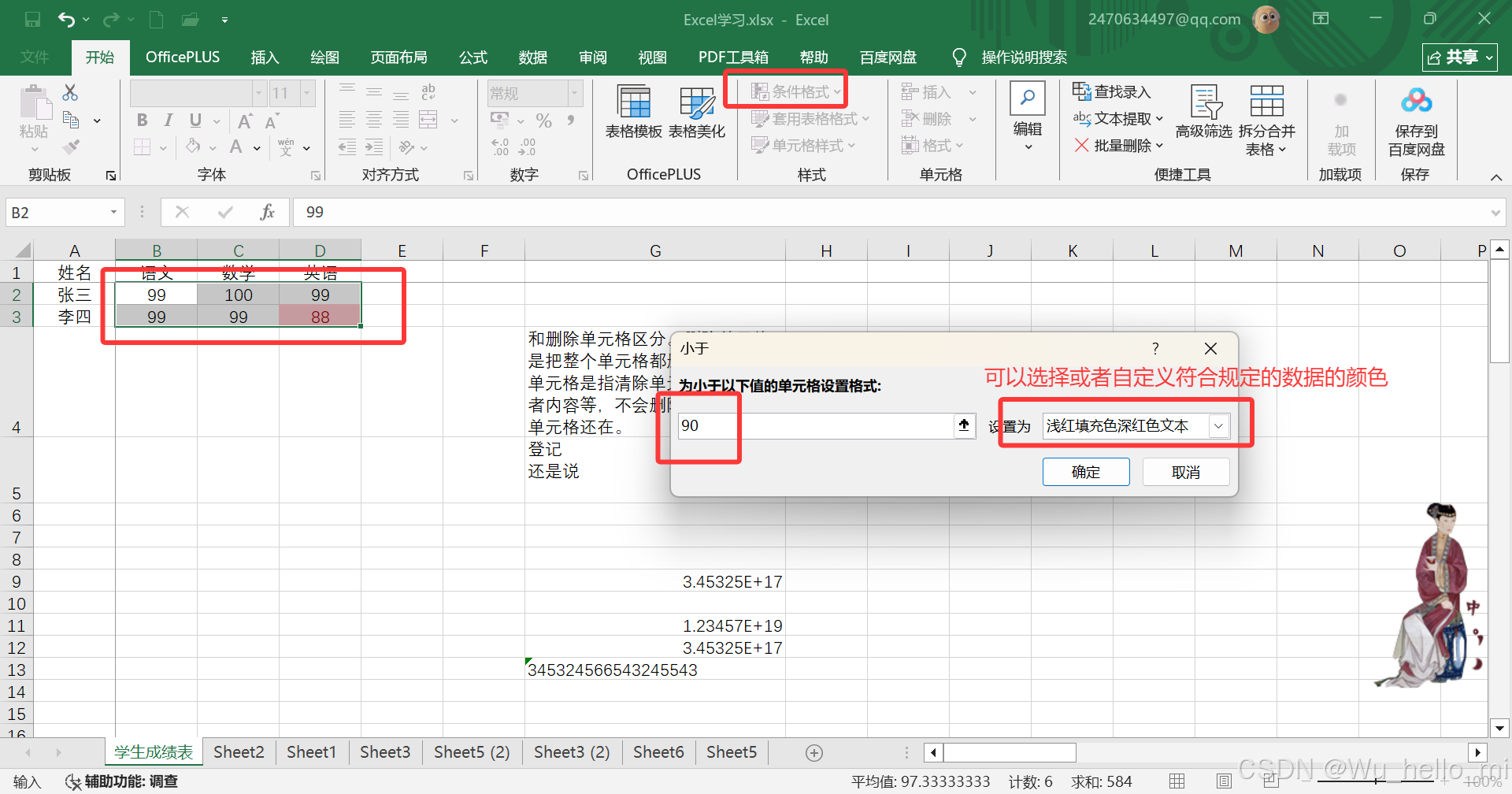 选择所有成绩单元格-》点击【样式】中的【条件格式】-》点击【突出显示单元格规则】-》点击【小于】-》输入数据(这里是90)
