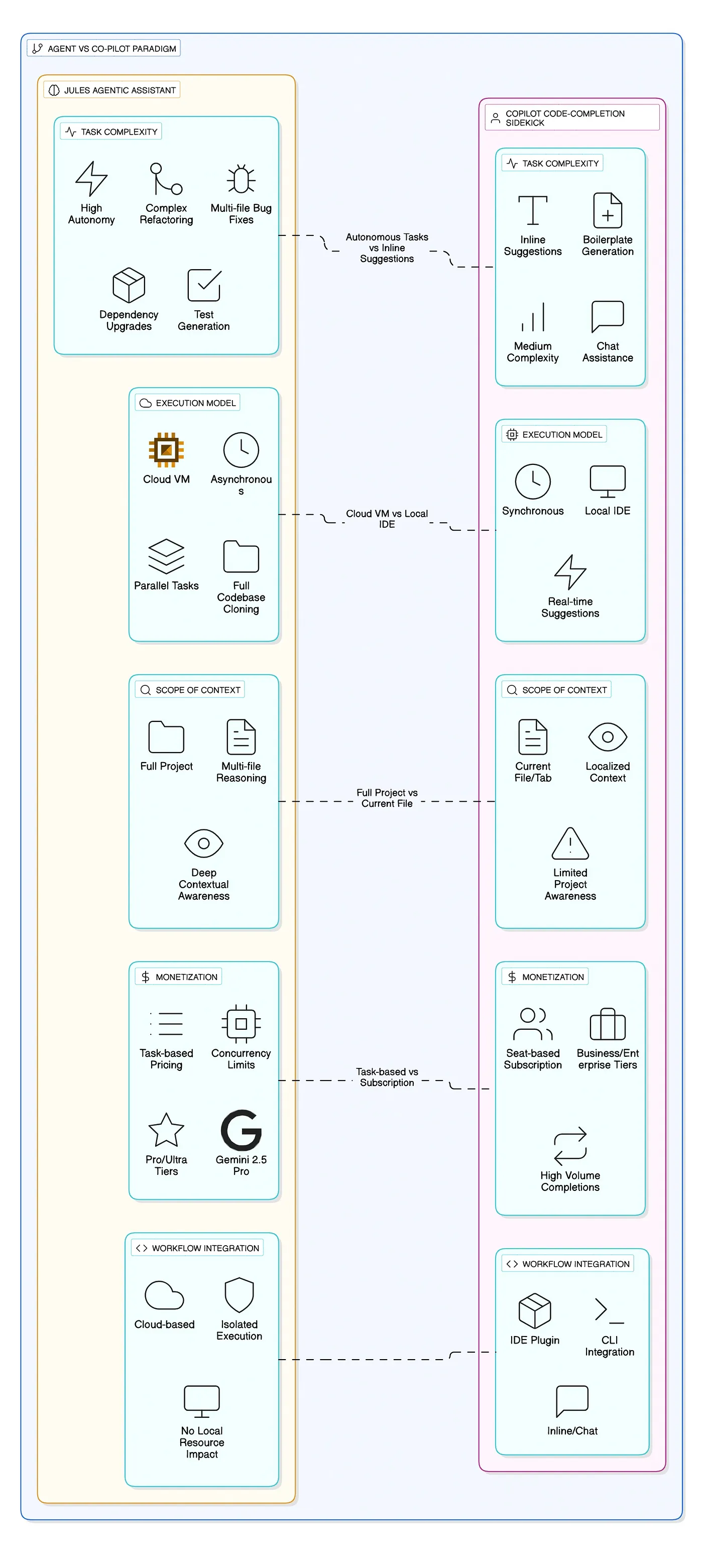 Jules和Copilot之间的竞争差异源于根本不同的架构设计和操作理念,这些决定了每个工具能够有效处理的任务复杂性。Jules被明确定位为 "智能编码助手",与传统的 "副驾驶" 或 "代码补全伙伴" 不同。