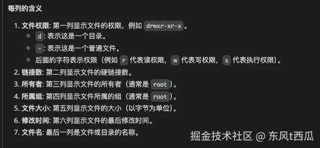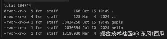 命令分解 ls: 是 "list" 的缩写,用于列出目录中的文件和子目录。 -la: 是 ls 命令的选项,组合了两个功能: -l: 显示文件的详细信息(如权限、所有者、大小、修改时间等)。 -a: 显示所有文件,包括隐藏文件(以 . 开头的文件)。 /usr/local/go/bin/: 是目标目录的路径。这个目录通常是 Go 编程语言的二进制文件所在的位置,例如 go 可执行文件。