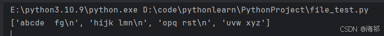 由运行结果可以看出,输出的是一个列表,是因为readlines()函数将文本内容读取为列表,每一行变成列表的一个元素