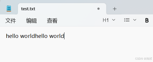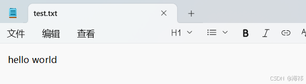 在这里"w"表示写入模式,调取write()函数来进行写入'hello world',查看现在文档内容: