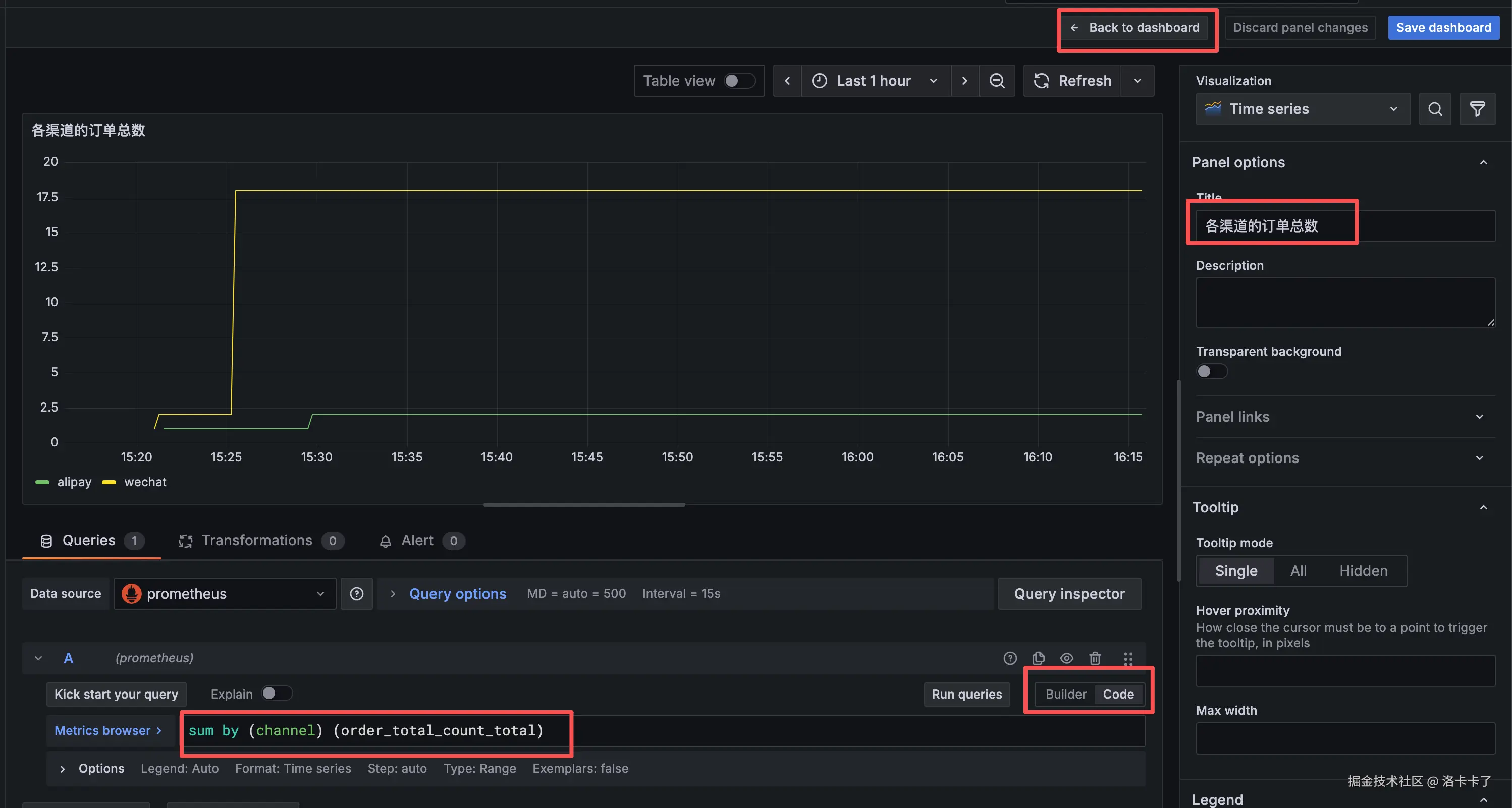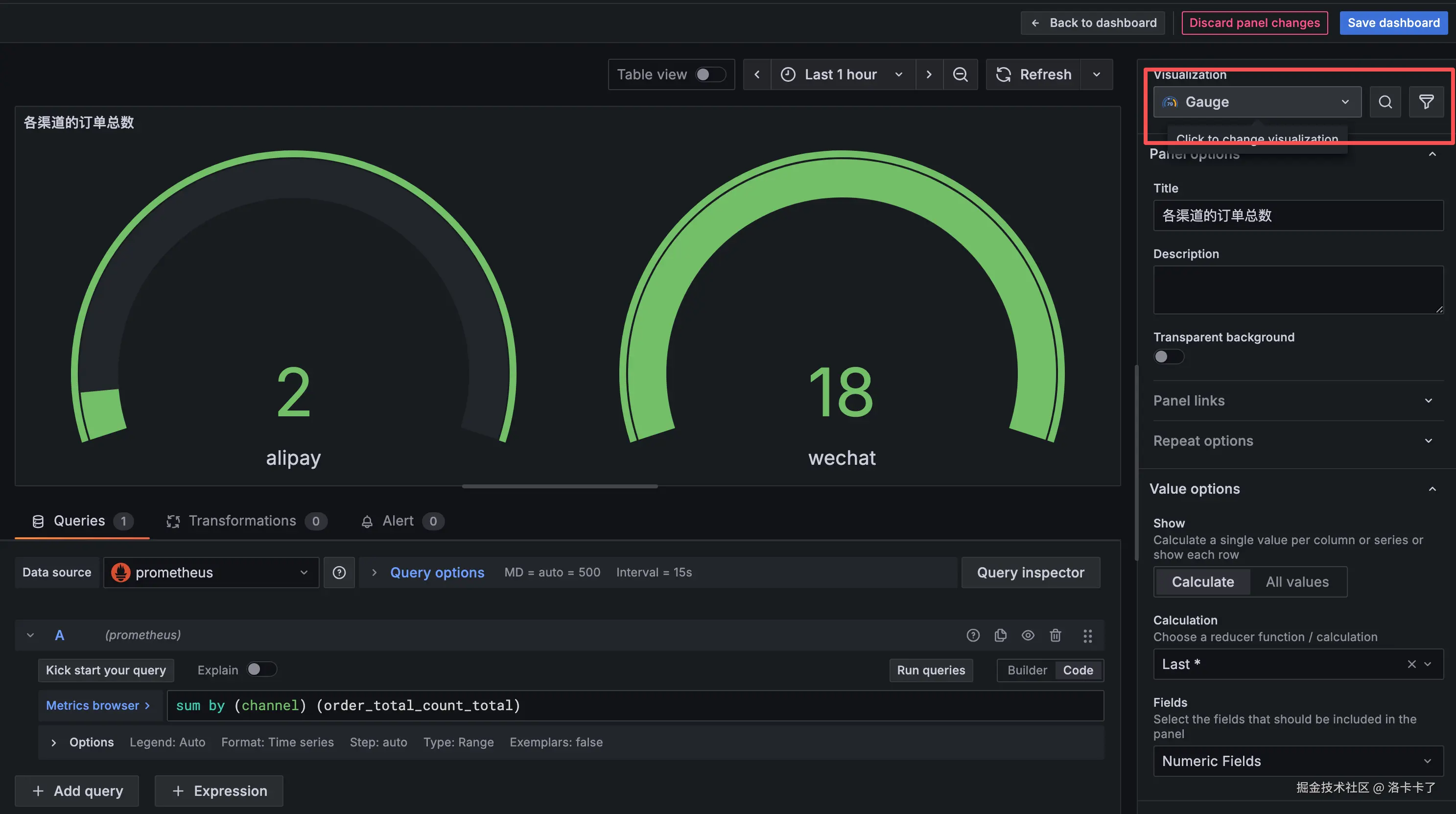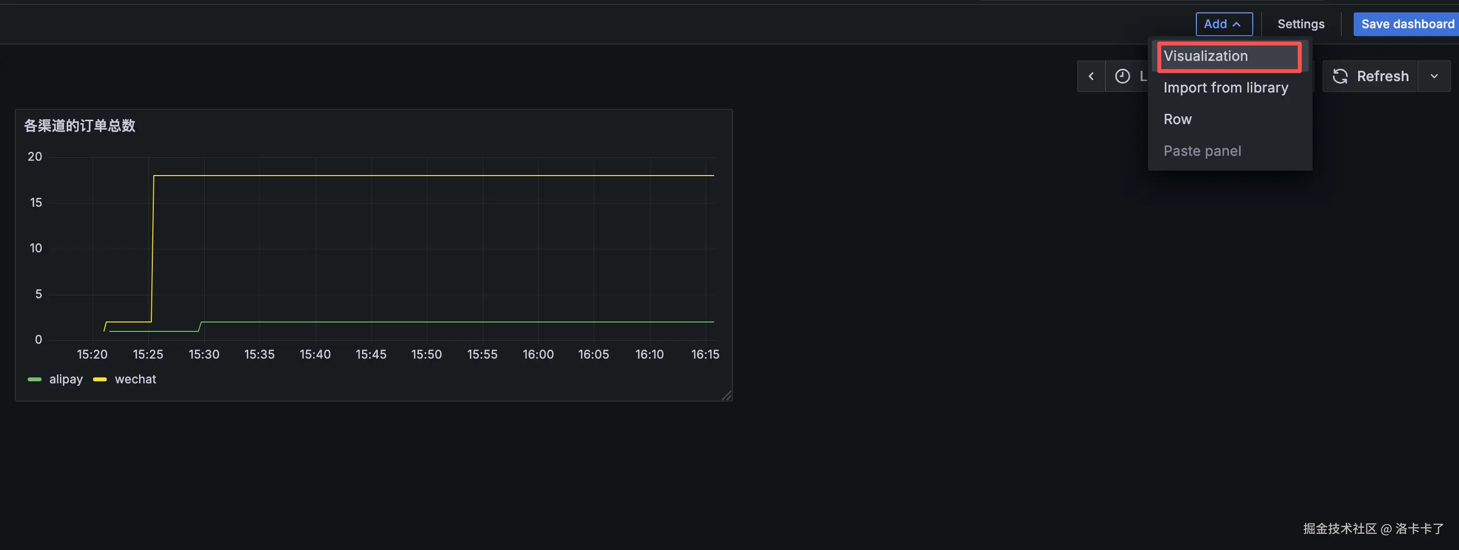 Grafana 就会实时绘制出每个渠道(如 wechat、alipay)的订单总数。