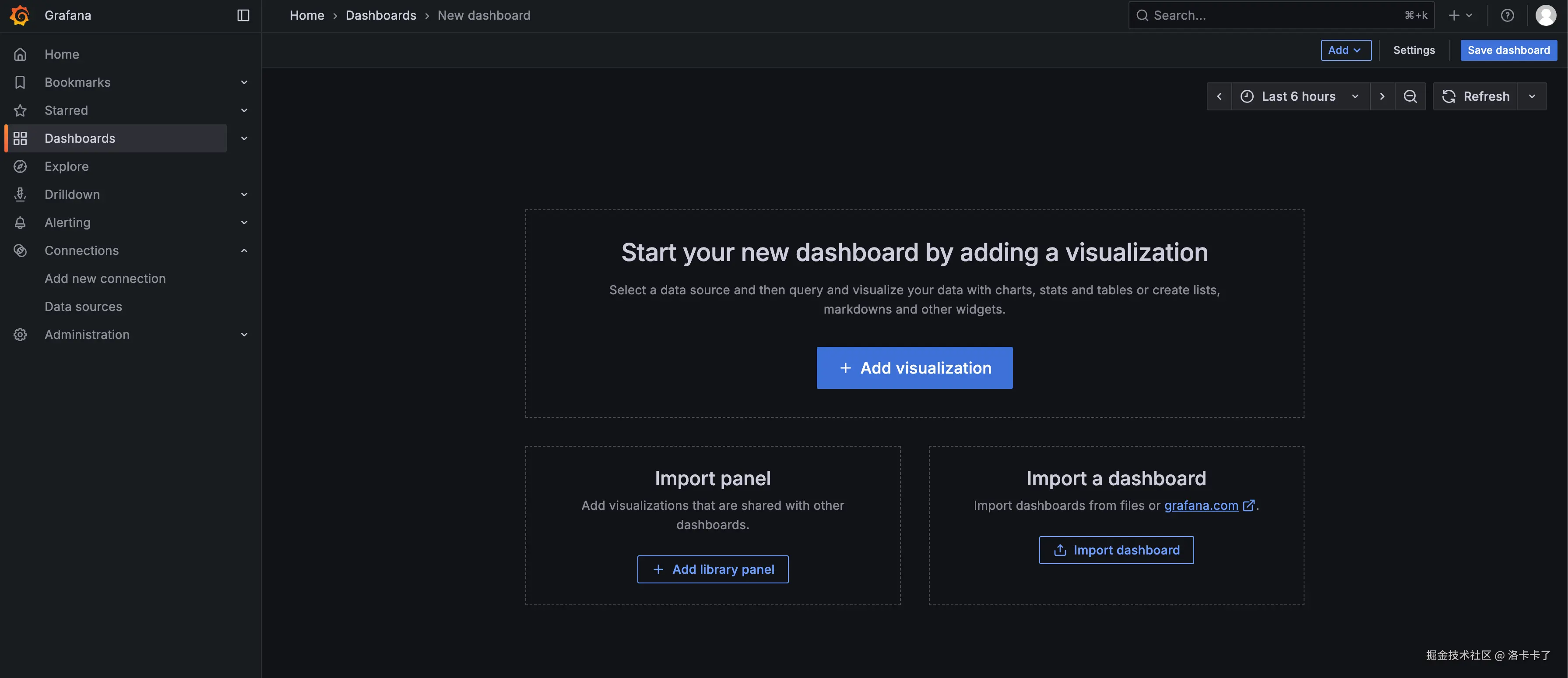 "Dashboard → New -> New Dashboard -> Add Visualization 。
