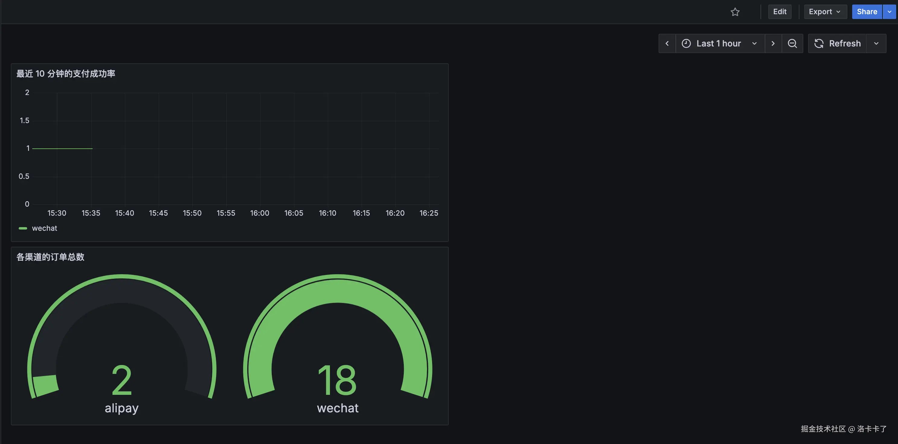 接下来我们就可以在 Grafana 上把它们可视化成各种业务图表,比如支付成功率、订单金额趋势、渠道对比等,