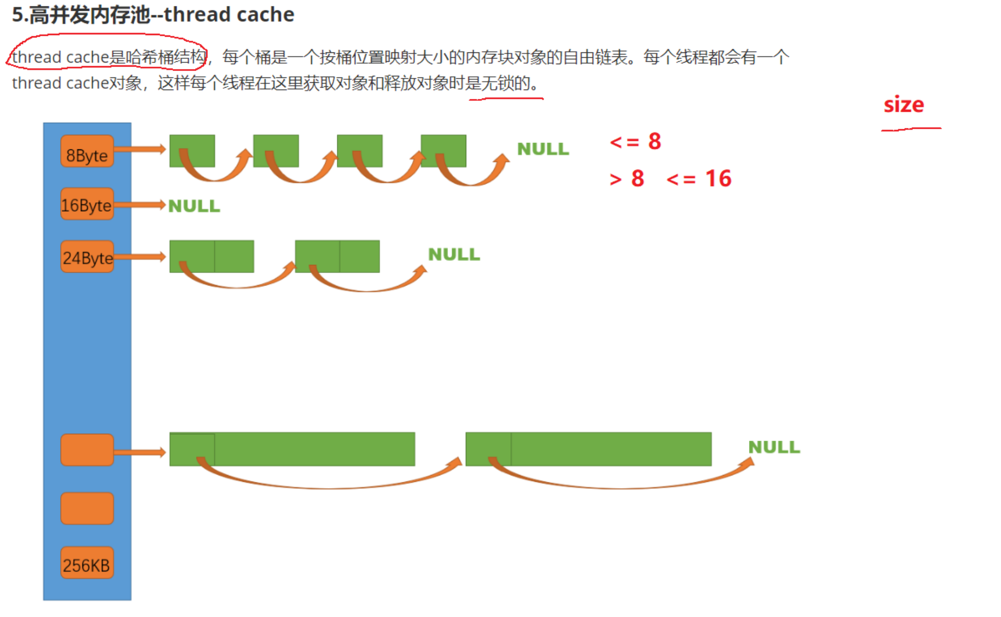 分析:thread cache是哈希桶结构,实现时用数组来记录每个桶的起始指针。其中每个桶是定长字节数的自由链表。每个线程都会有一个thread cache对象。