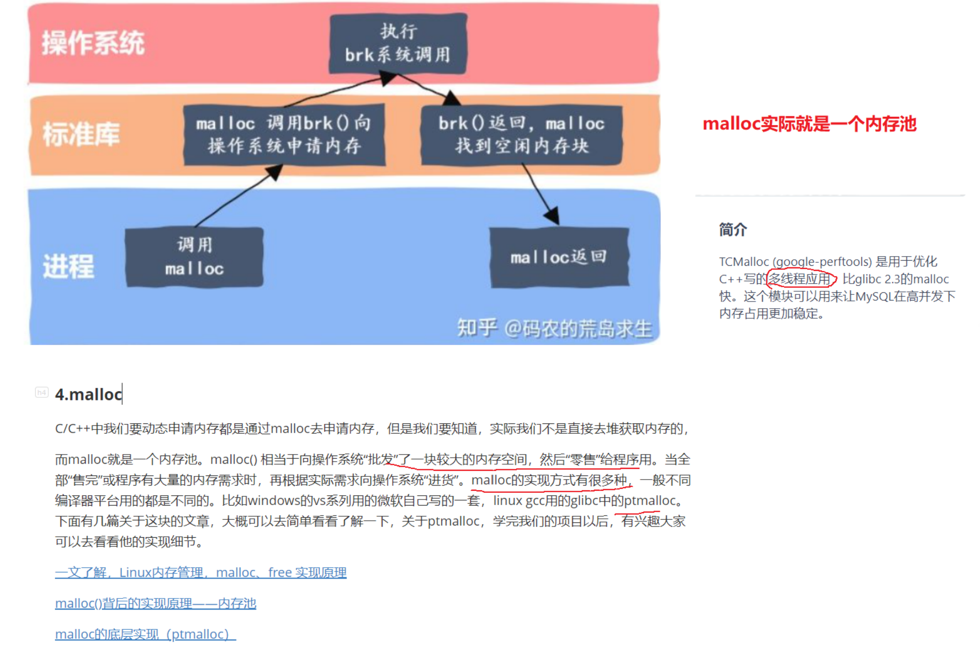 流程:malloc调用,转而执行glibc封装的系统调用brk/mmap,向OS申请内存。返回带回结果,malloc维护大块内存块(malloc实际就是一个内存池)