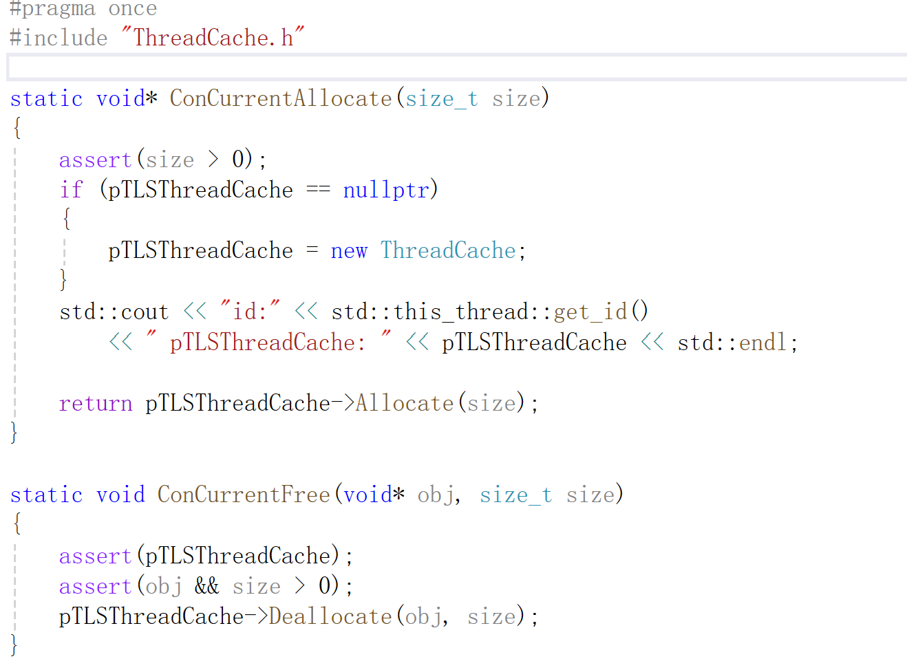 static __declspec(thread) ThreadCache* pTLSThreadCache=nullptr;线程局部存储,存储ThreadCache指针(静态线程局部存储只能定义内置类型,指针是内置类型),保证每个线程都有独立的一份。