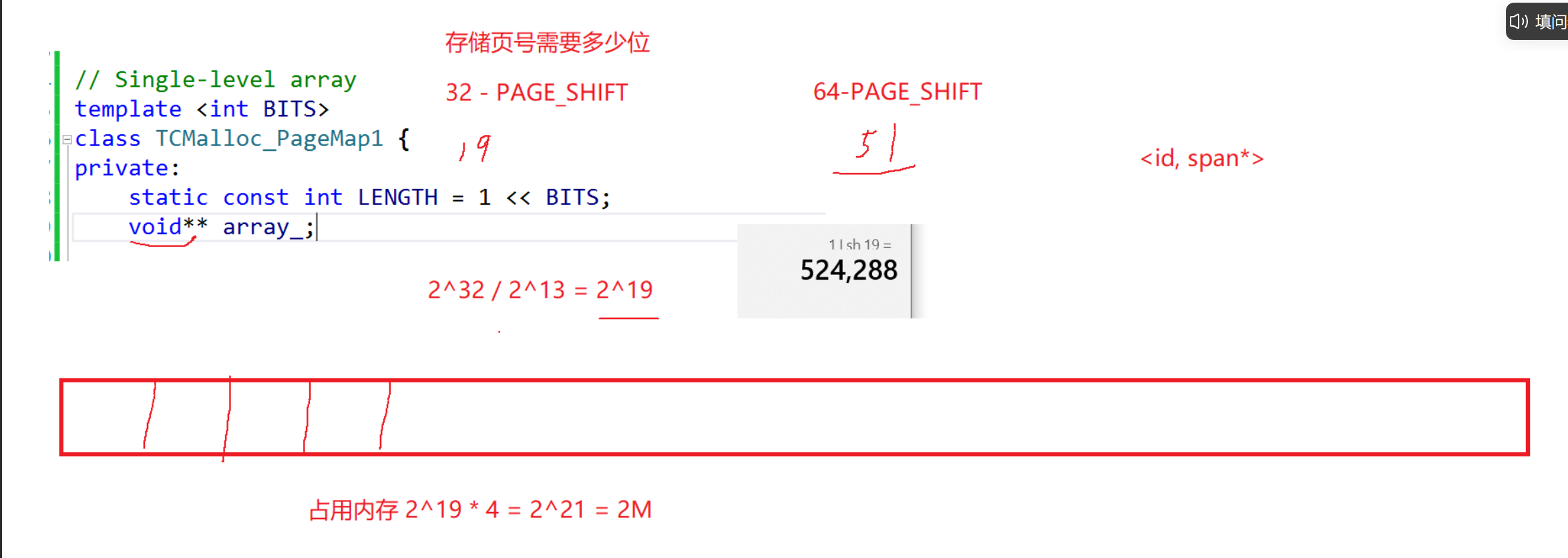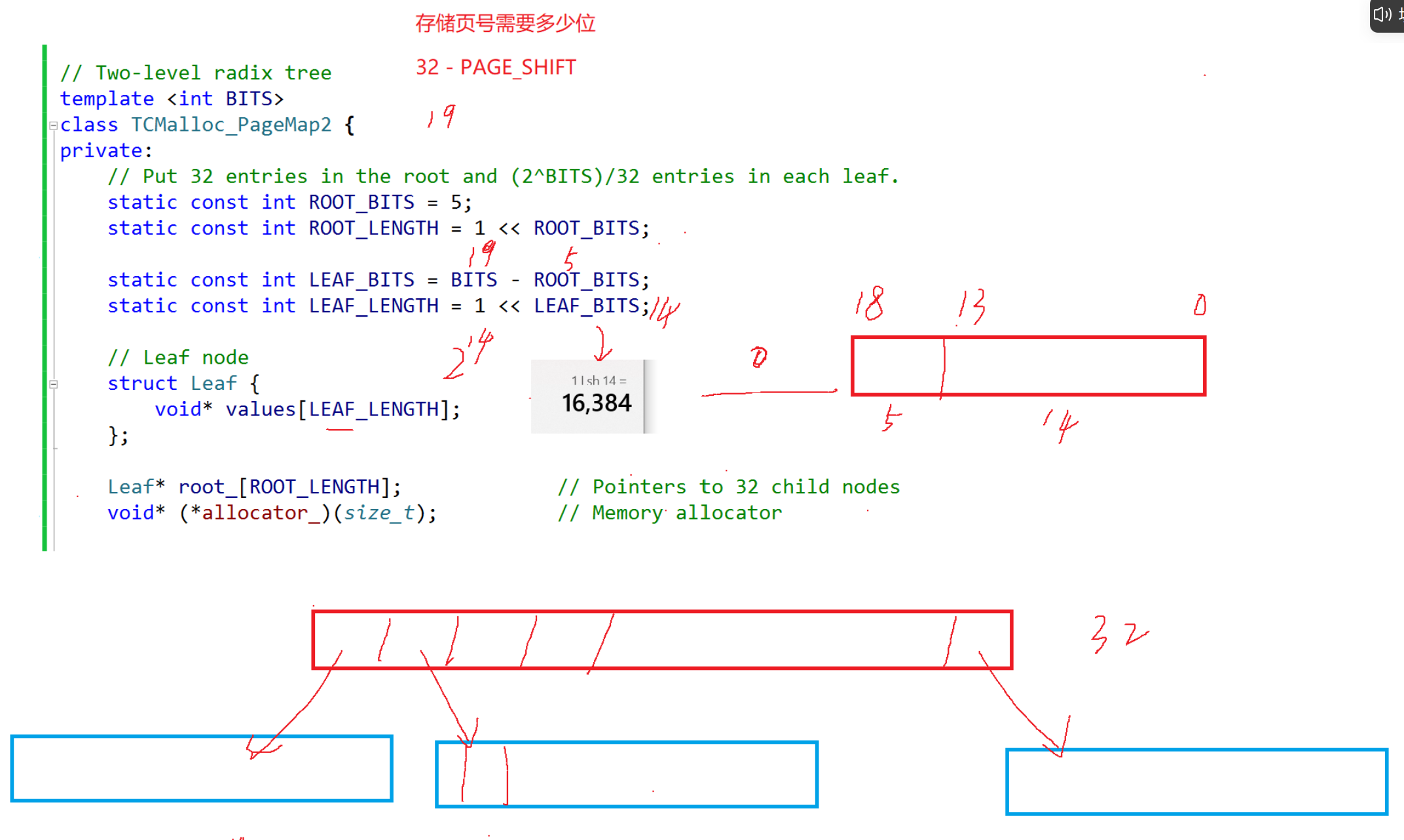 一阶基数树是直接映射,pageId直接映射对应的指针(pageid, Span*)。BITS非类型模版参数指的是存储页号需要多少位。