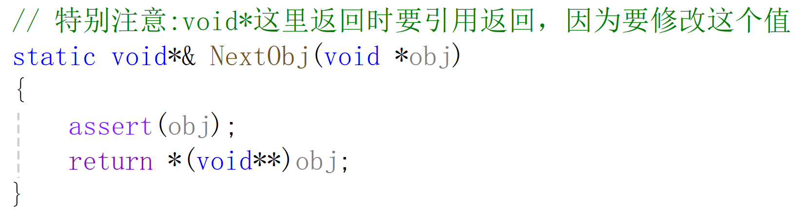 细节3:获取下一个内存地址函数返回值要写成void*&,因为在Delete头插_freeList时,要修改这个指针的值(这个指针的值代表就是前指针大小的内容)