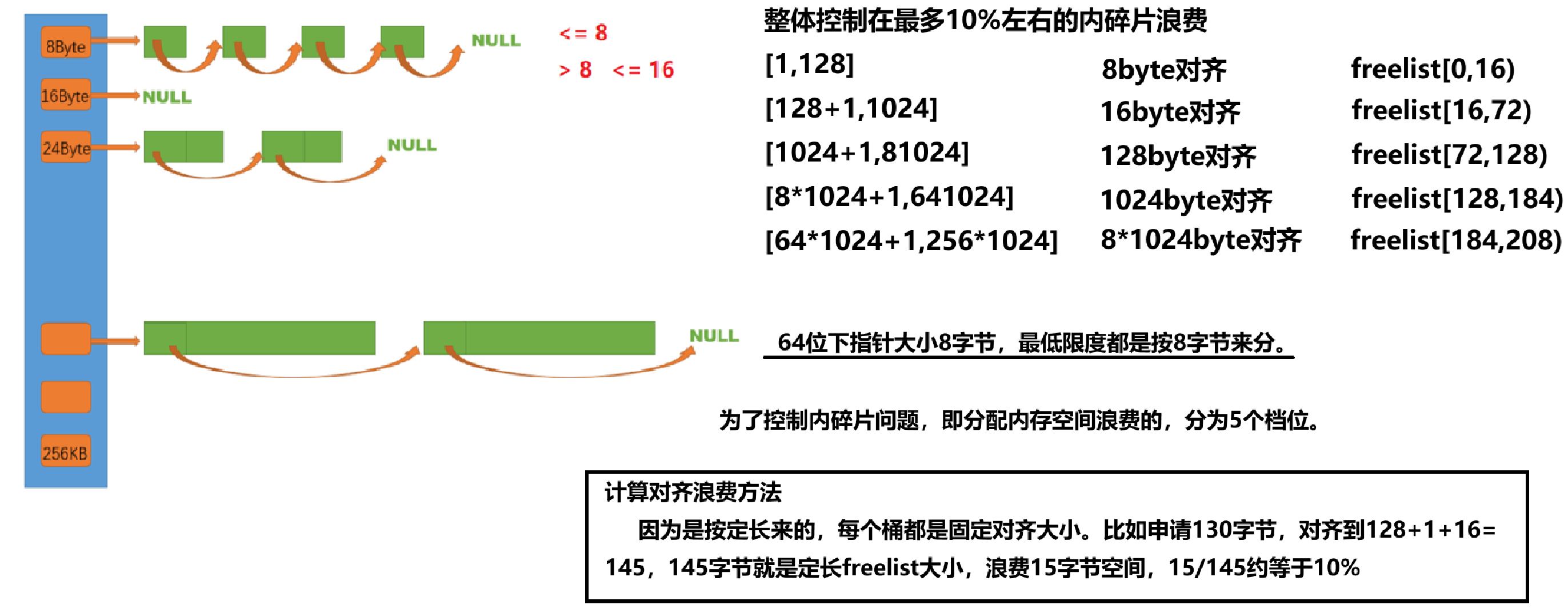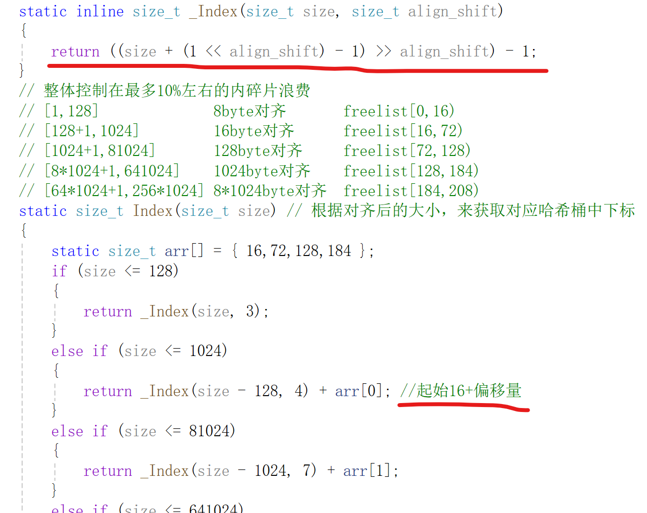 2)计算对应FreeList下标思路:起始桶位置+区间内桶偏移量,每个区间桶起始位置不一样,对齐数也不一样。
