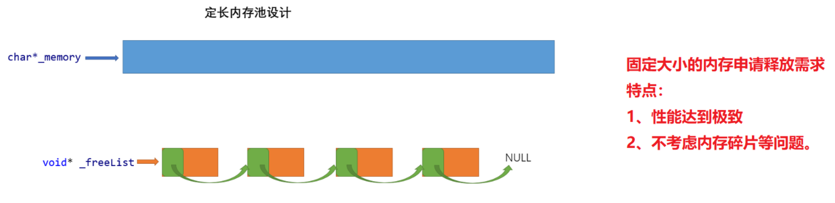 _freeList:自由链表,存放delete归还的内存块,内存块前指针大小个字节存放下一个内存块起始地址。