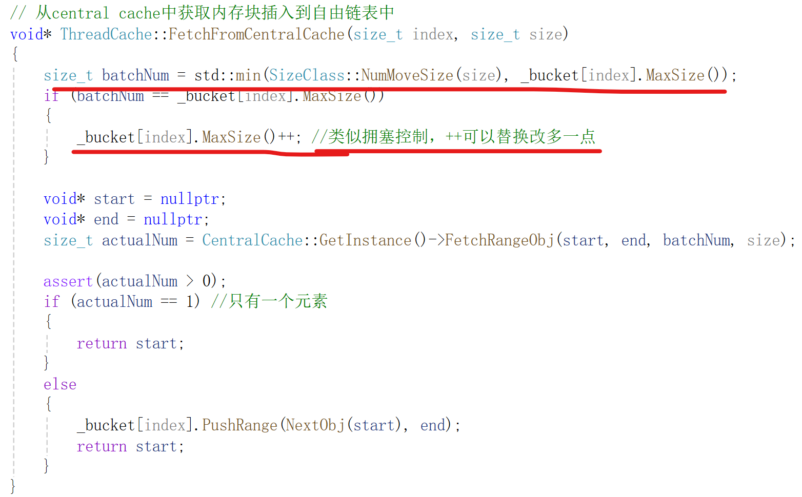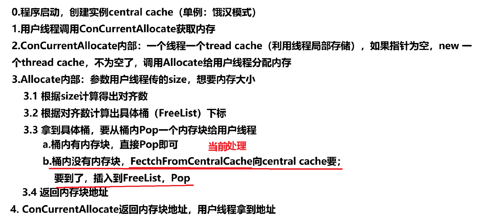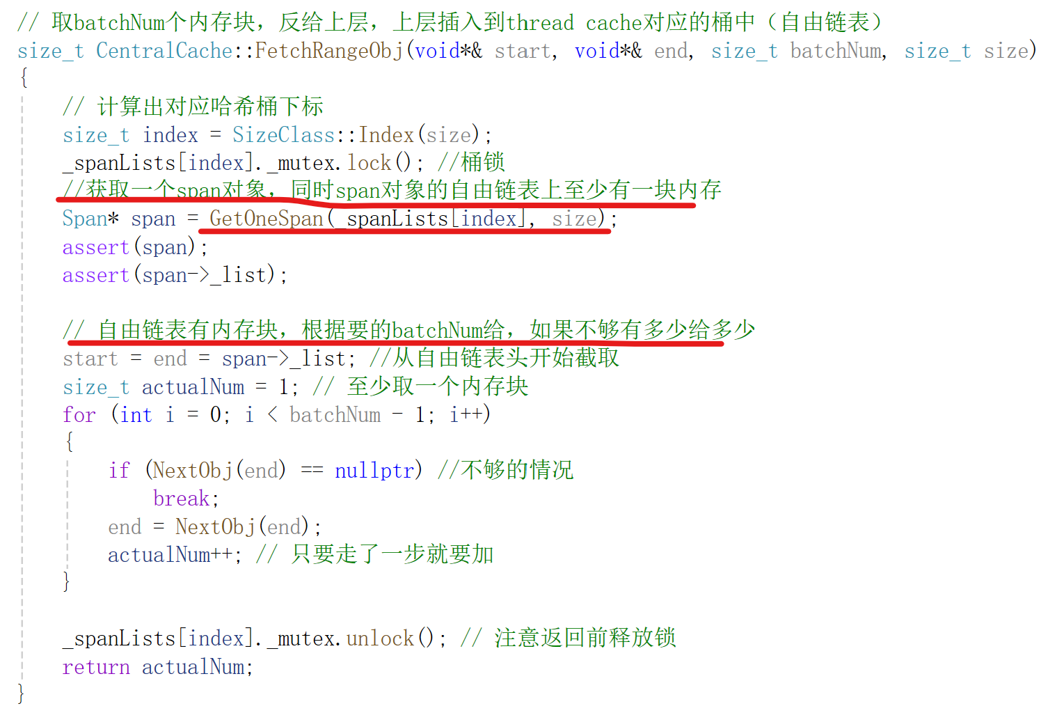 - 特别注意1:central cache的FetchRangeObj取[start,end]范围时,一定要给NextObj(end)置nullptr,断开来,否则就和后面的黏在一起了。而且截取完后,需要修改span->_freeList的值。