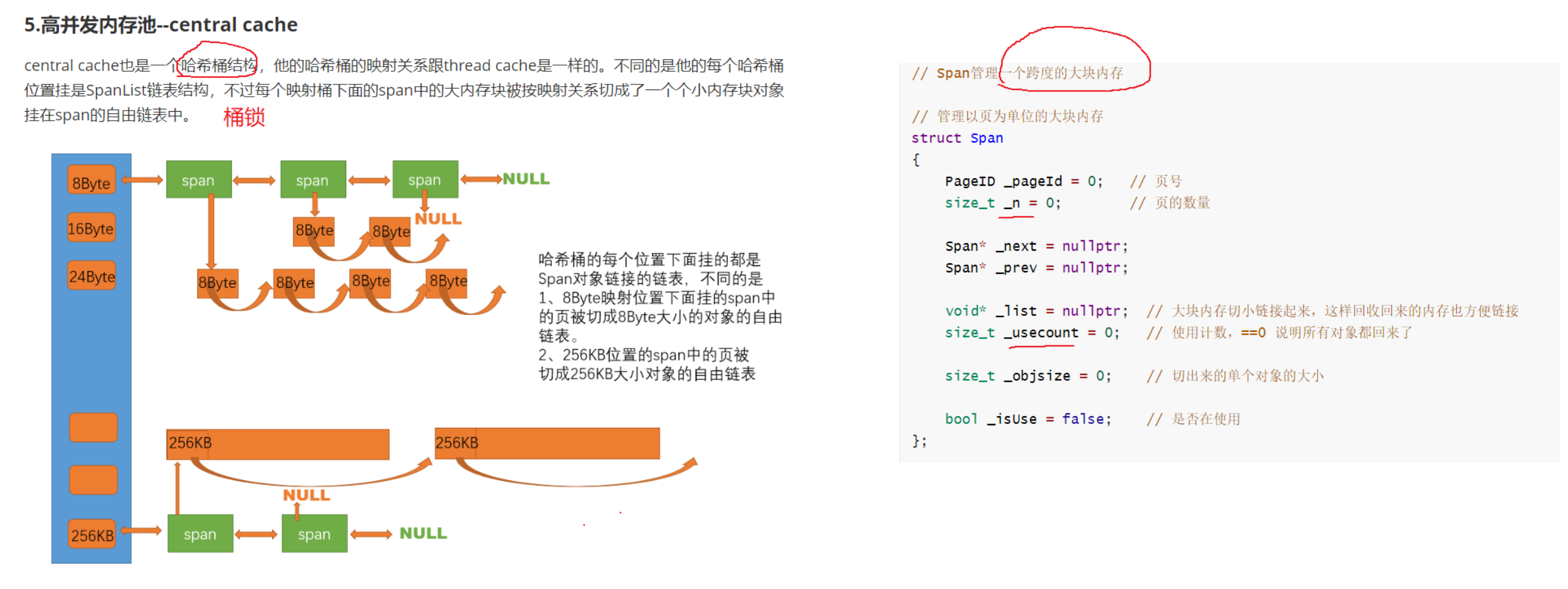 central cache的哈希桶存放一条存span的双向带头循环链表(先描述,在组织),因为哈希桶采用的是桶锁,所以双链表内还要带一个锁成员。