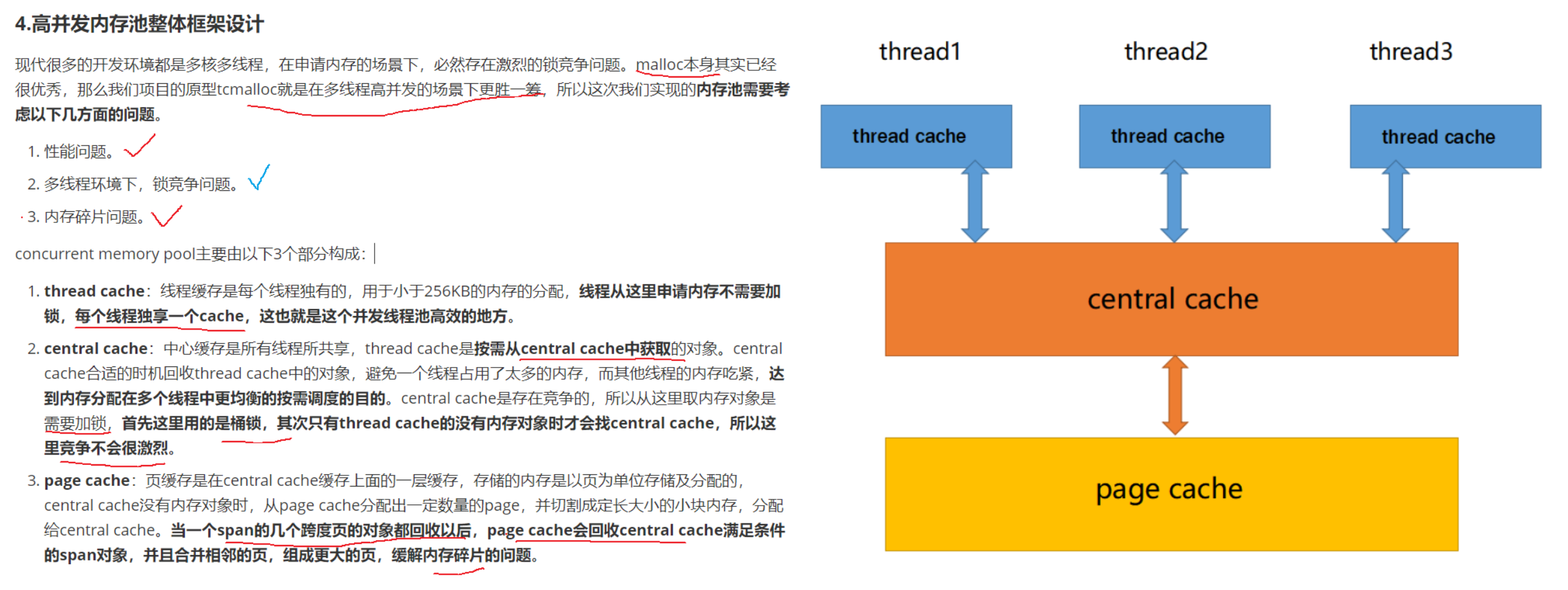 3)page cache:页缓存,存储的内存是以页为单位存储和分配的。当一个span的几个跨度也的对象都被回收后,page cache会回收central cache符合条件的内存块,用来合并相邻页,组成更大的页,减少内存碎片问题。
