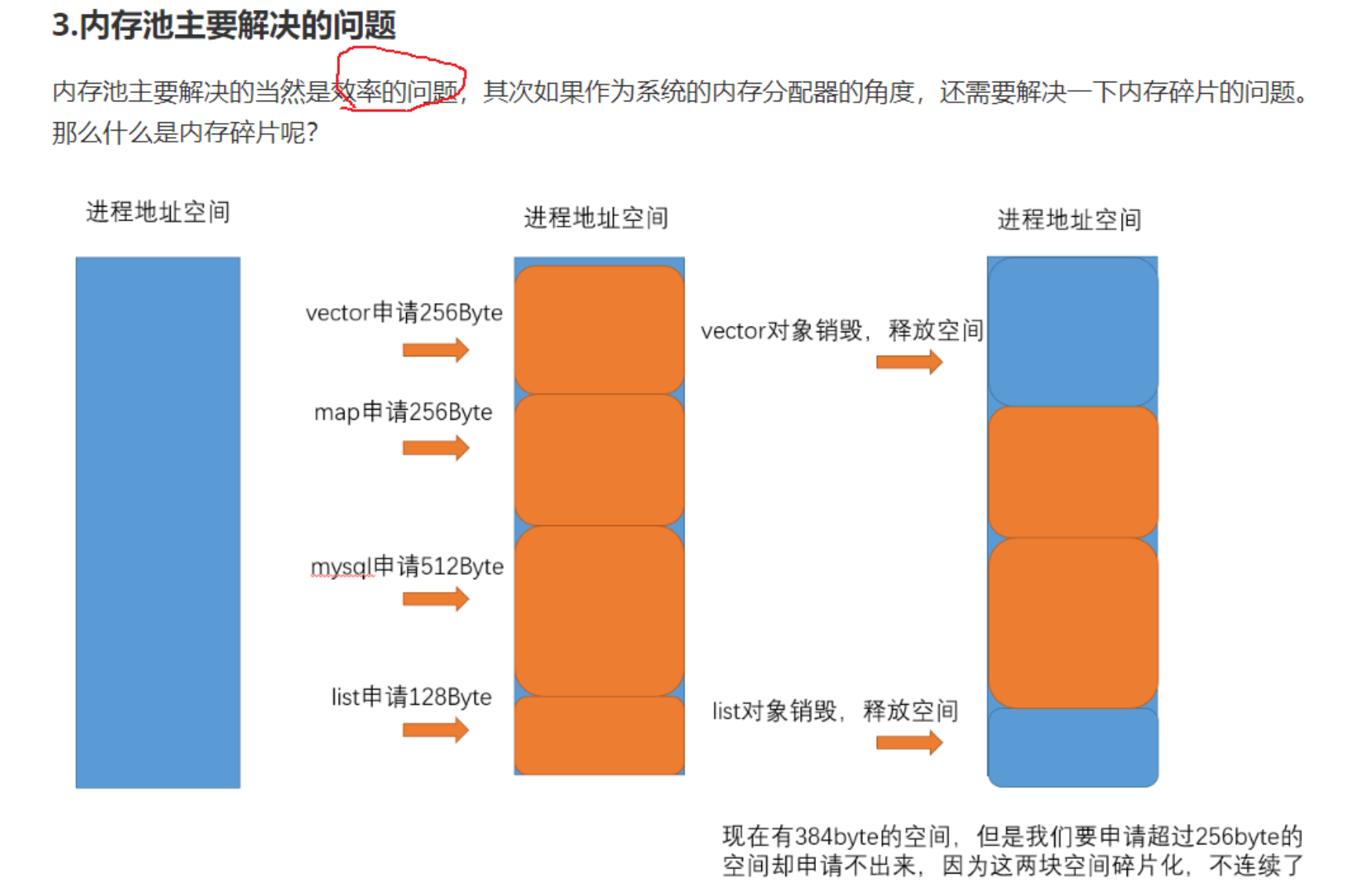 主要解决问题:1)效率问题,池化技术解决 2)解决内存碎片问题