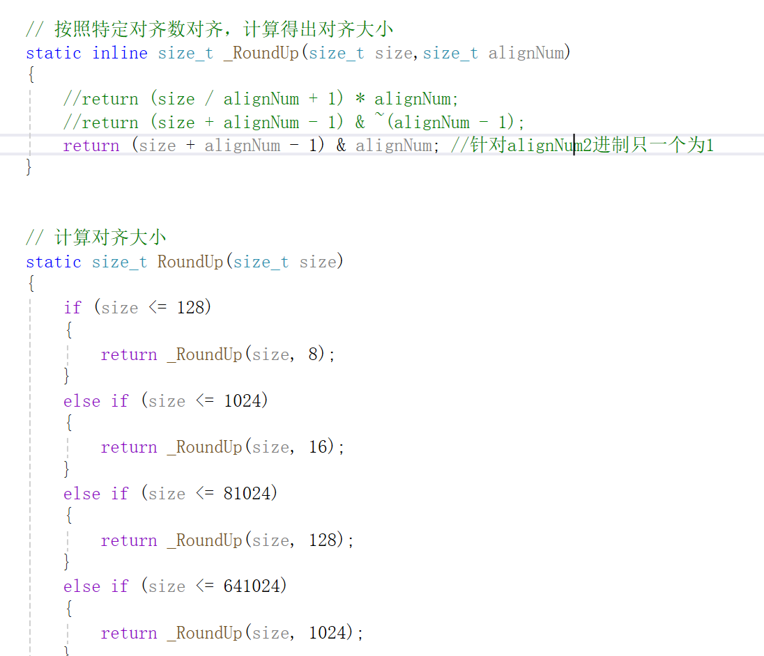 1)计算对齐大小思路:判断size落到哪个区间,在用该区间对齐数进行对齐