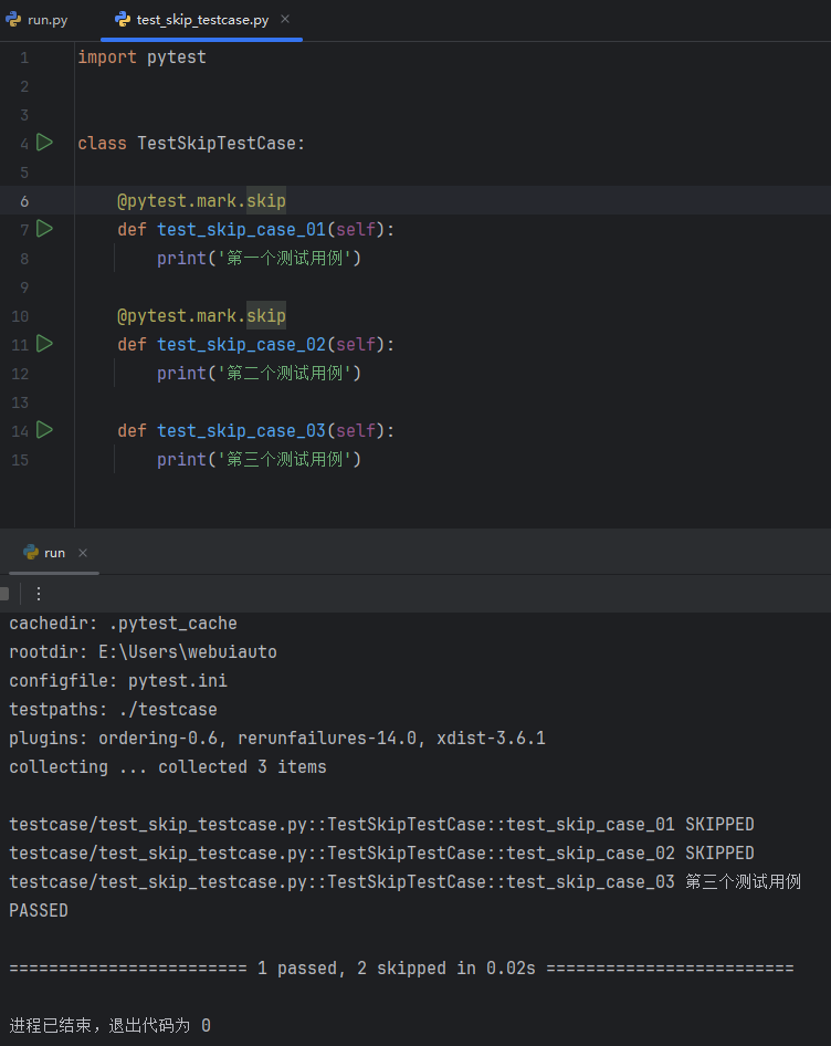 跳过执行在实际工作场景中,也是使用比较多的;有的测试用例不想执行,通过装饰器来跳过测试用例的执行;