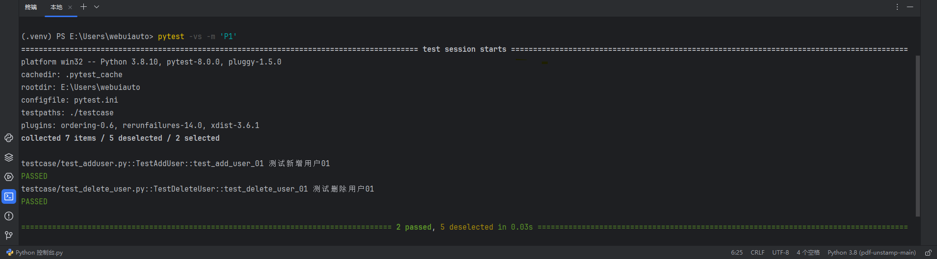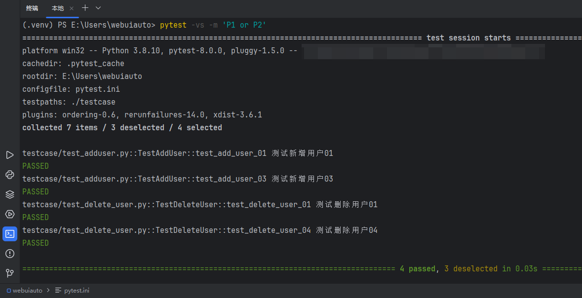 使用 -m 去执行分组的测试用例,使用 -m 参数加上标记分组名称'P1',运行时只执行 P1 级测试用例;执行多个时使用关键词'not、and、or'等;