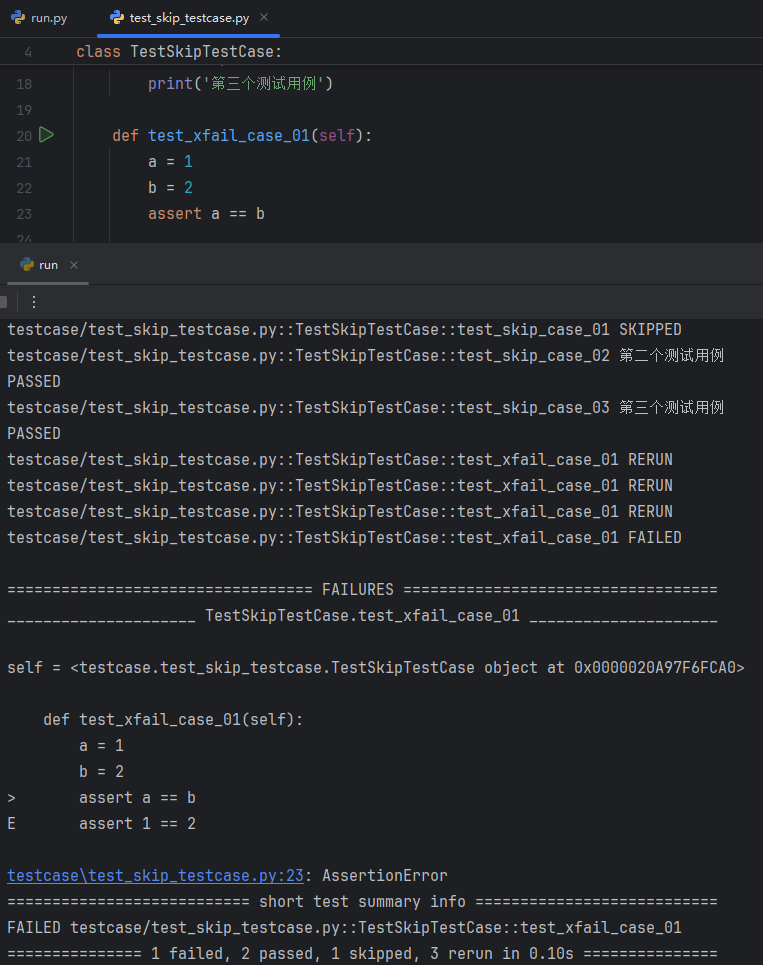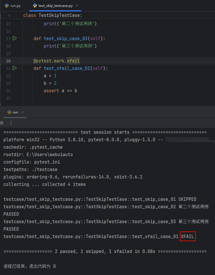 明确知道某一条测试用例肯定会失败,但是如果打上 pytest.mark.xfail 标签,这条测试用例仍然会去执行,不会导致整体测试用例运行失败,只是将测试结果打上 xfailed 标签,并不是真正意义上的测试失败;